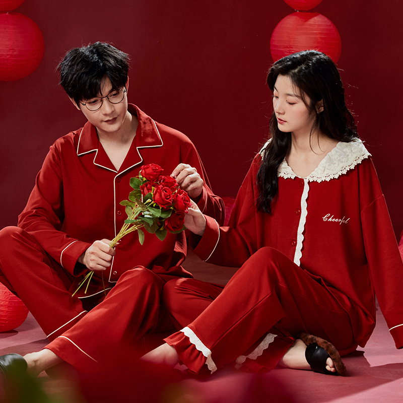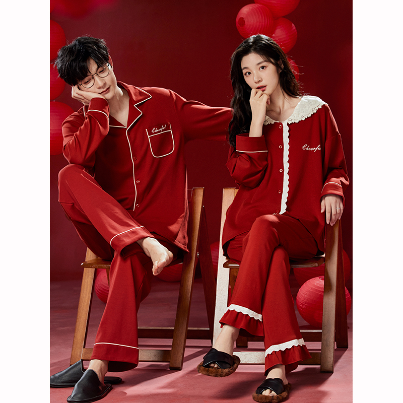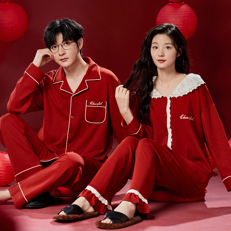 纯棉7A抗菌红色新婚男家居服套装 翻领长袖 24新款 情侣睡衣女春秋季