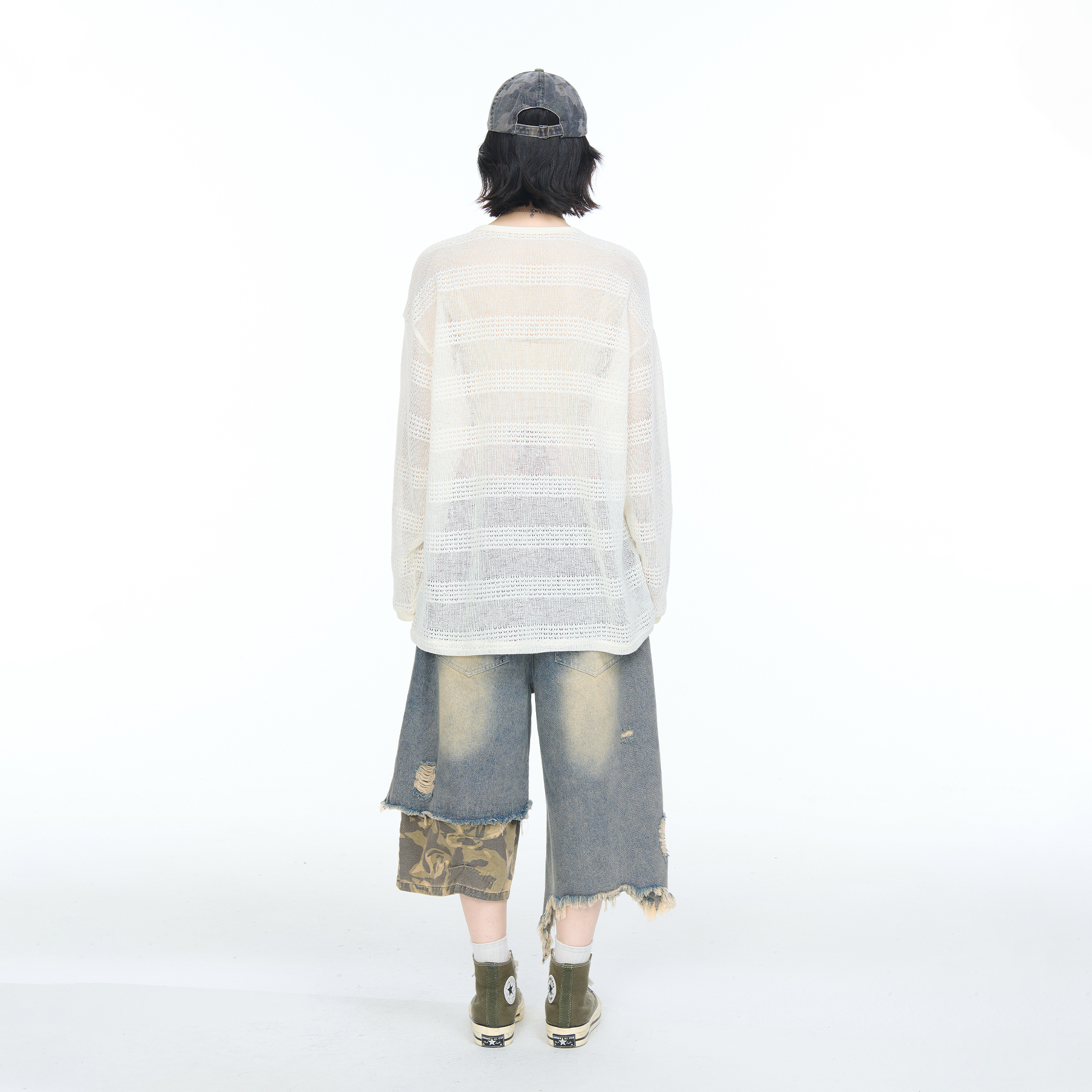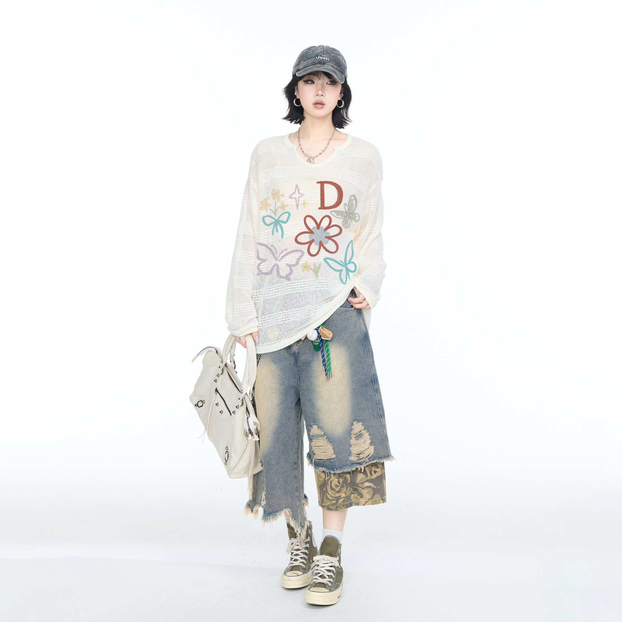 上衣春秋 T恤女松弛感防晒罩衫 美式 潮牌V领镂空轻薄微透蝴蝶长袖