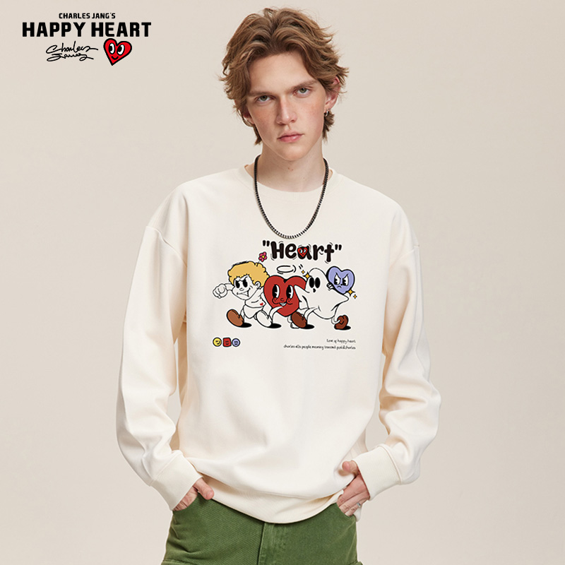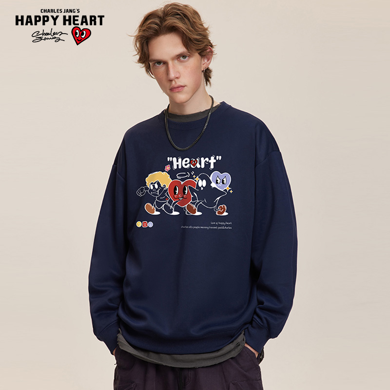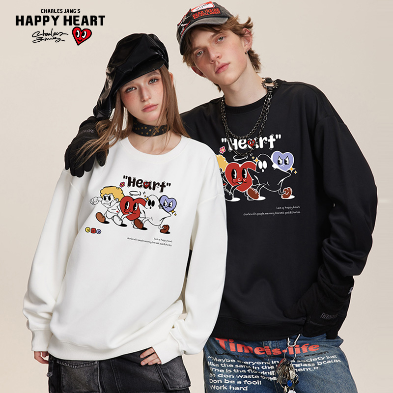 落肩袖 印花圆领卫衣男女春秋季 内搭 童趣四人行美式 查尔斯桃心