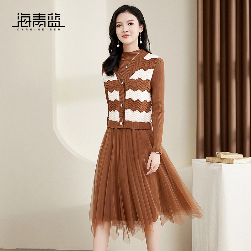 条纹马甲针织网纱裙两件套女 时尚 海青蓝气质小香风套装 裙秋冬新款