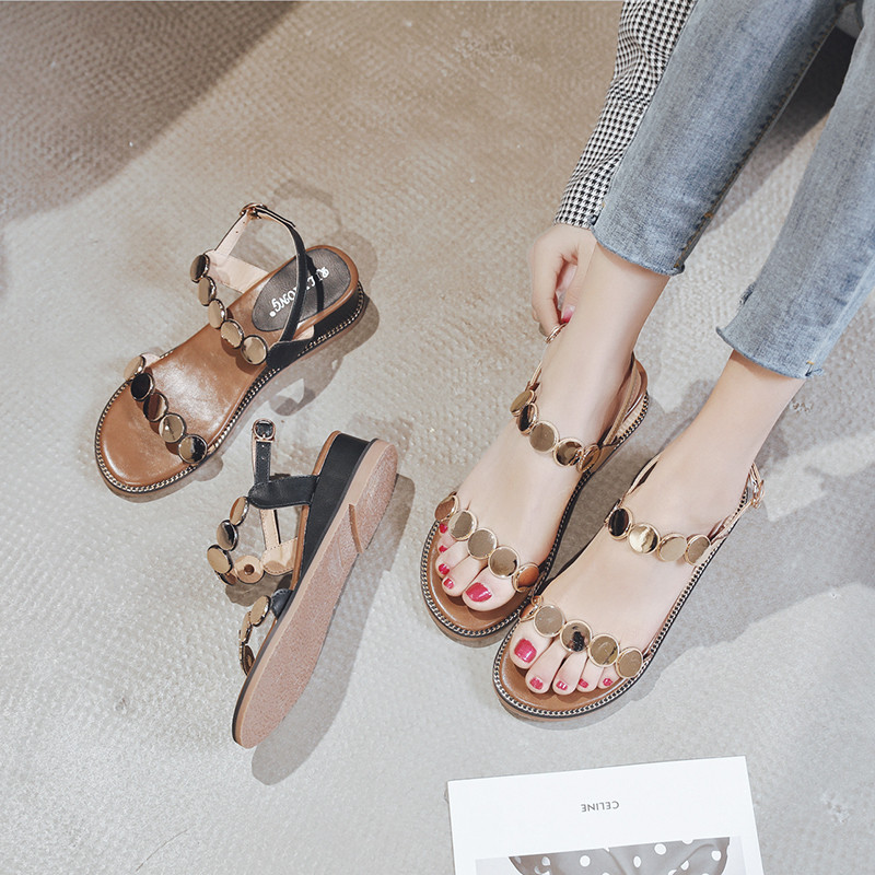 女2025年新款 一字带女鞋 夏季 百搭仙女风真皮坡跟软底时尚 韩版 凉鞋