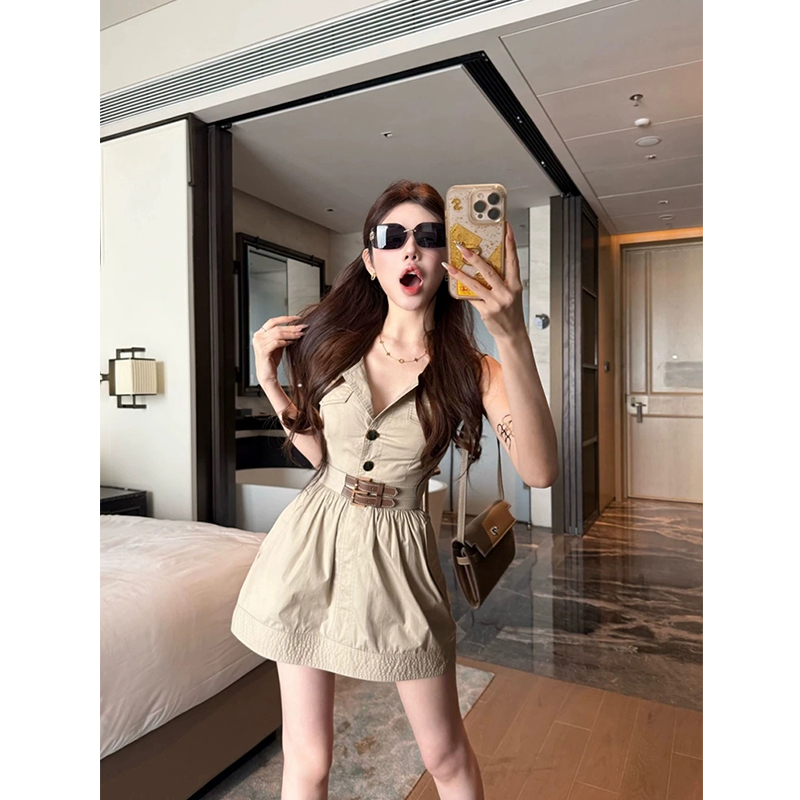 连衣裙女25年夏季 气质复古V领工装 设计感收腰A字短裙 微胖韩版 XZY