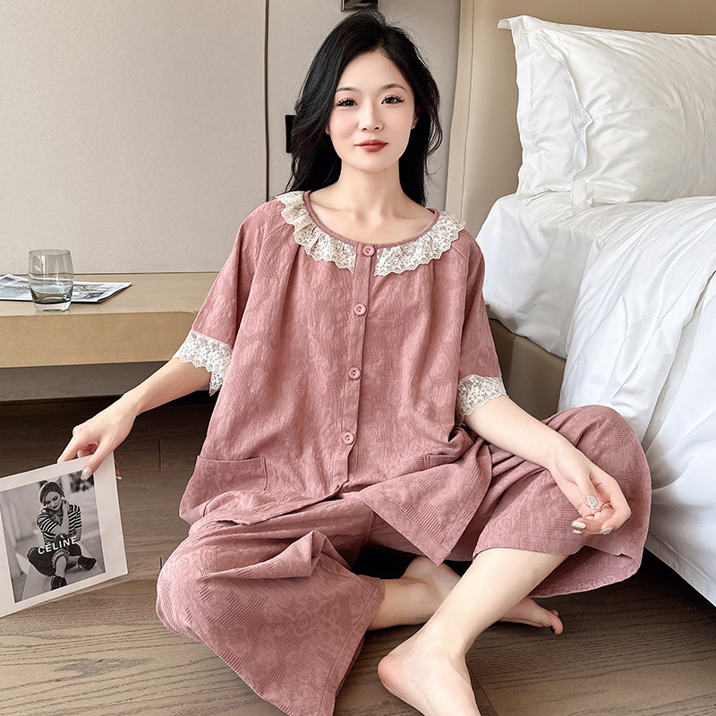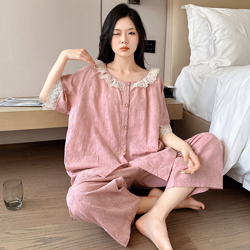 家居服加肥加大 夏纯棉提花200斤短袖 纱布睡衣女大码 胖mm2025新款