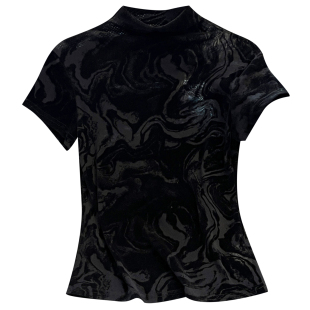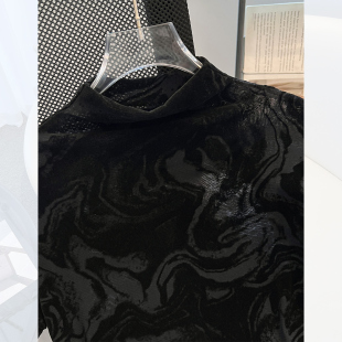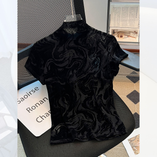上衣 金丝绒薄款 高级感黑色微透小半高领短袖 T恤女2025早秋新夏款