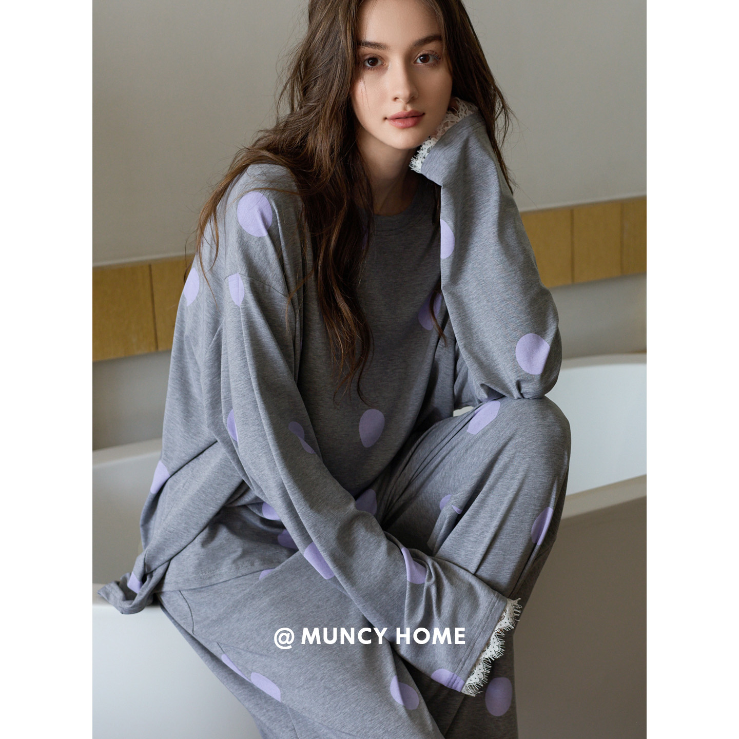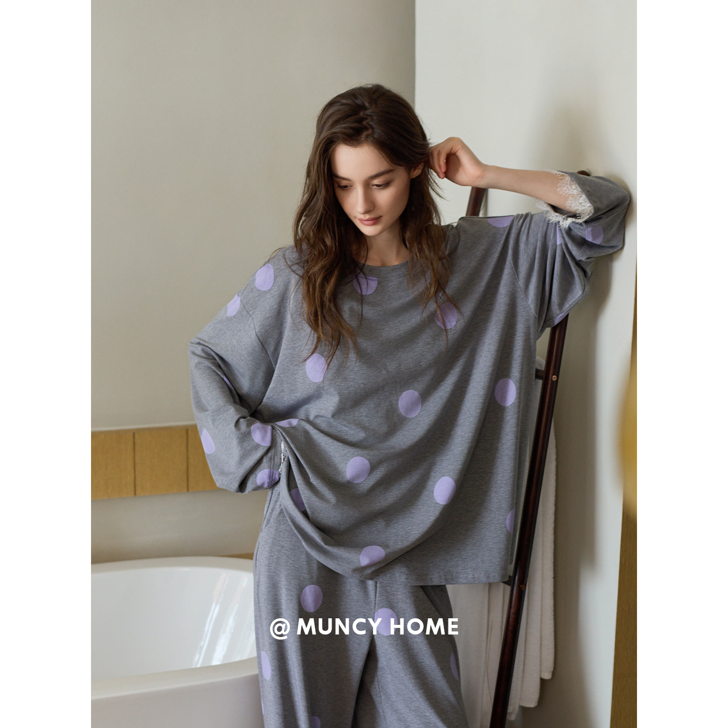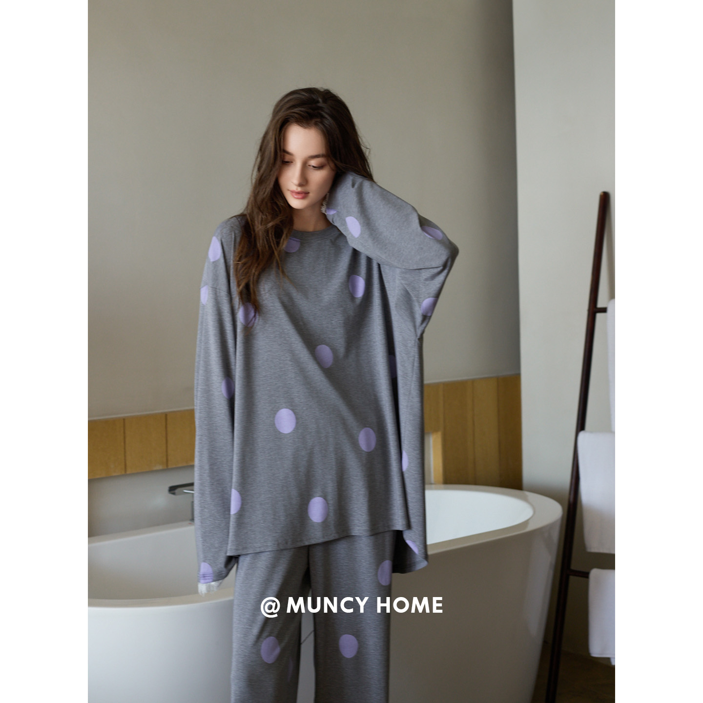 宽松慵懒少女新款 曼系 睡衣春秋季 长袖 圆领柔软家居服 韩系波点