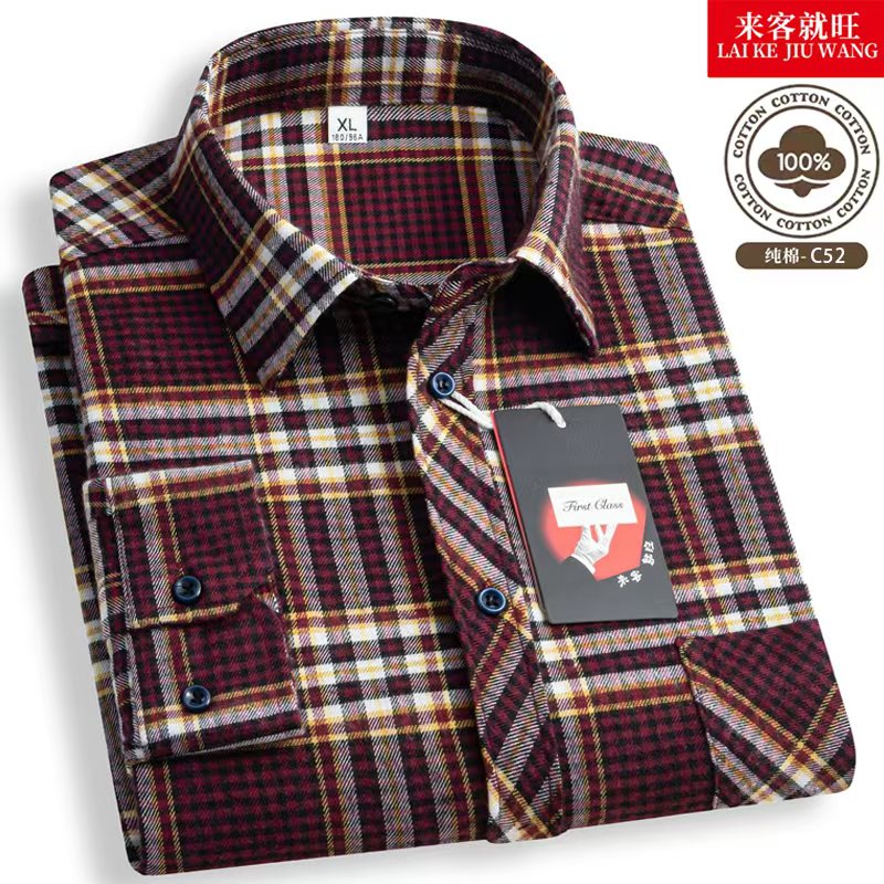 秋季 纯棉100%中老年男士 免烫休闲衬衣商务爸爸装 衬衫 流行 格子长袖