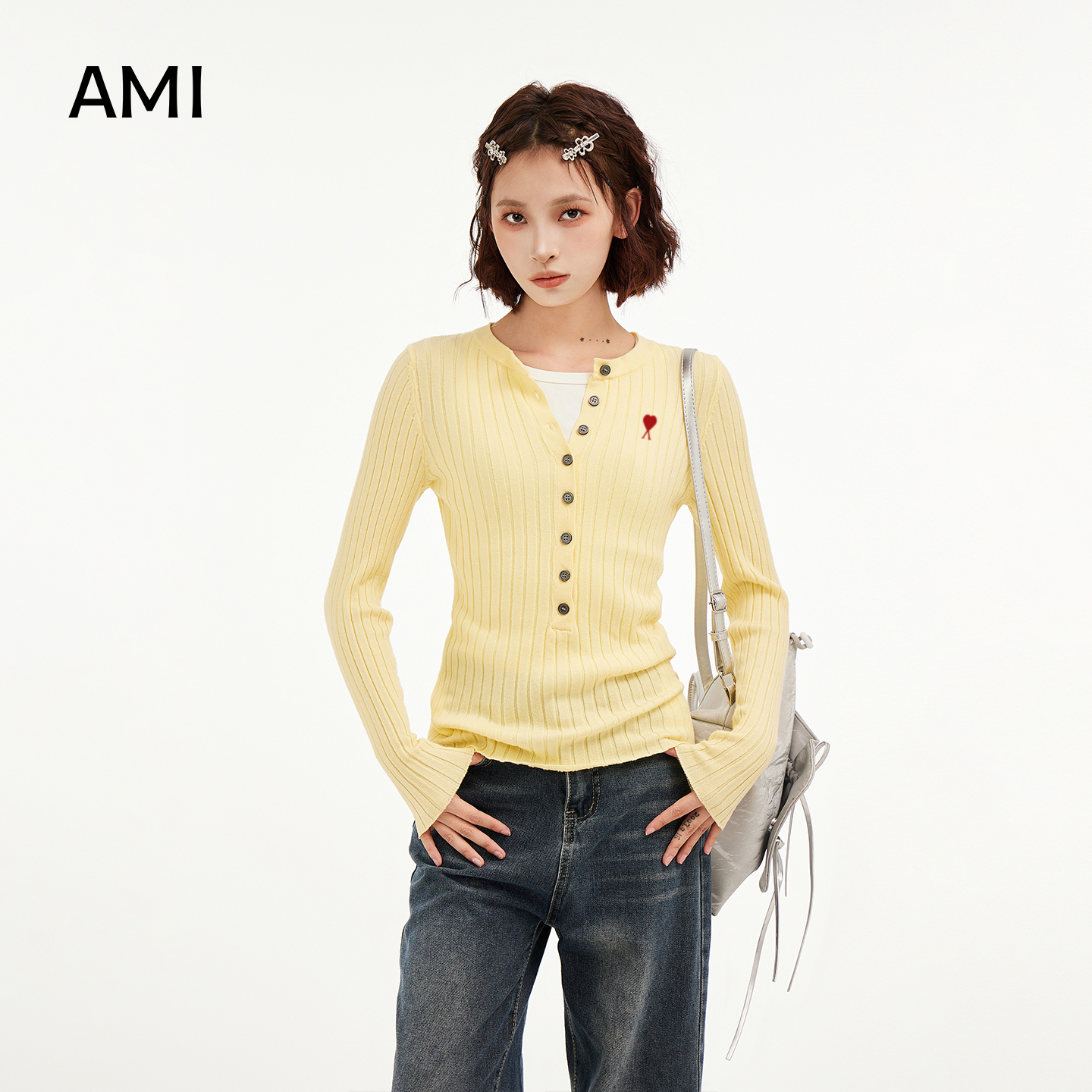 复古鹅黄色v领长袖 修身 毛衣针织衫 内搭短款 上衣潮 女春秋季 AMI美式