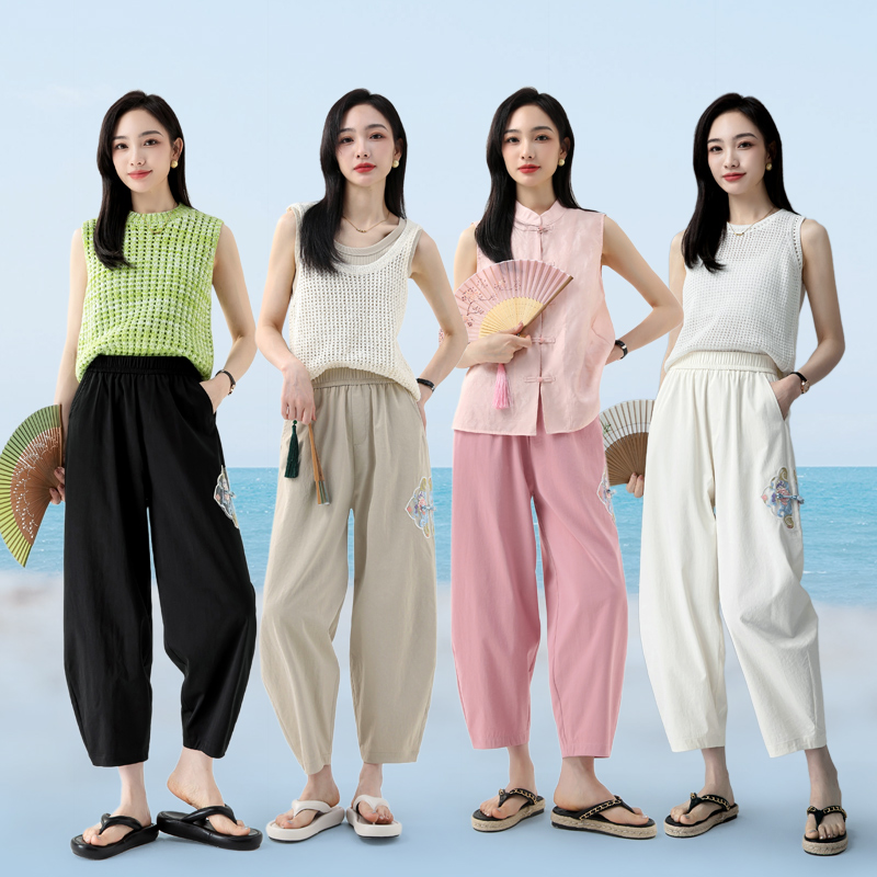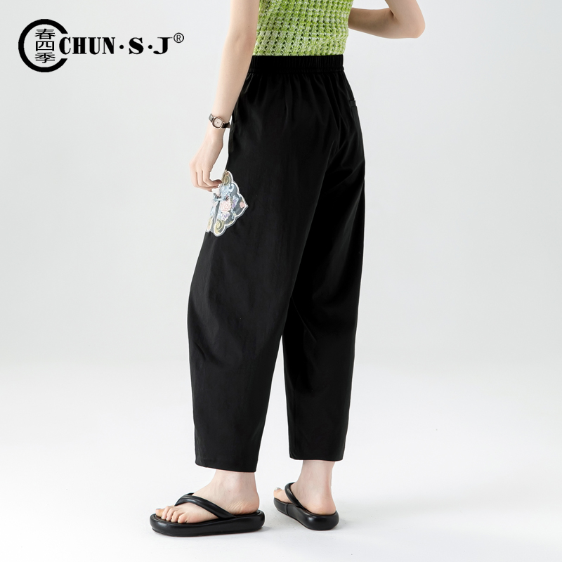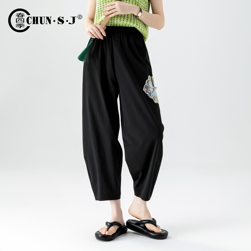 中式 薄款 刺绣休闲女裤 宽松香蕉裤 清仓黑色冰丝裤 女哈伦裤 子女夏季