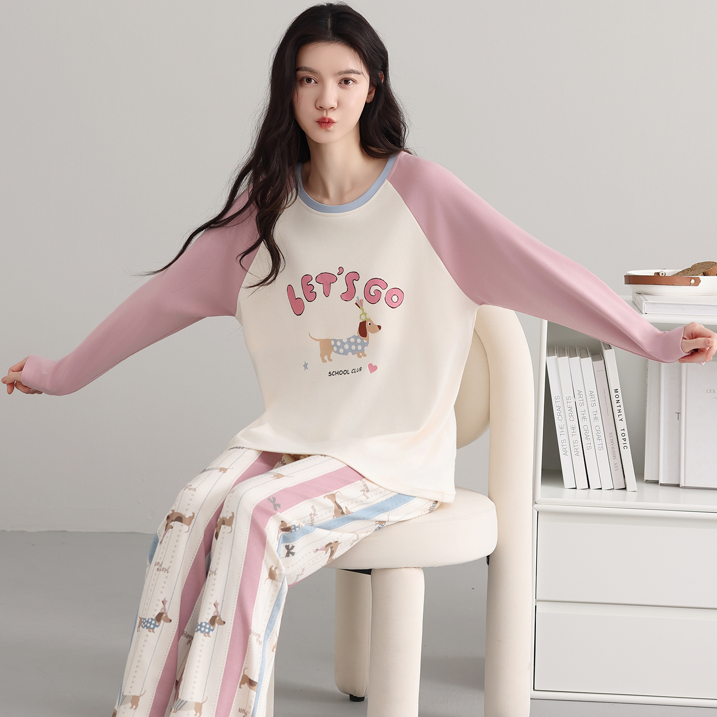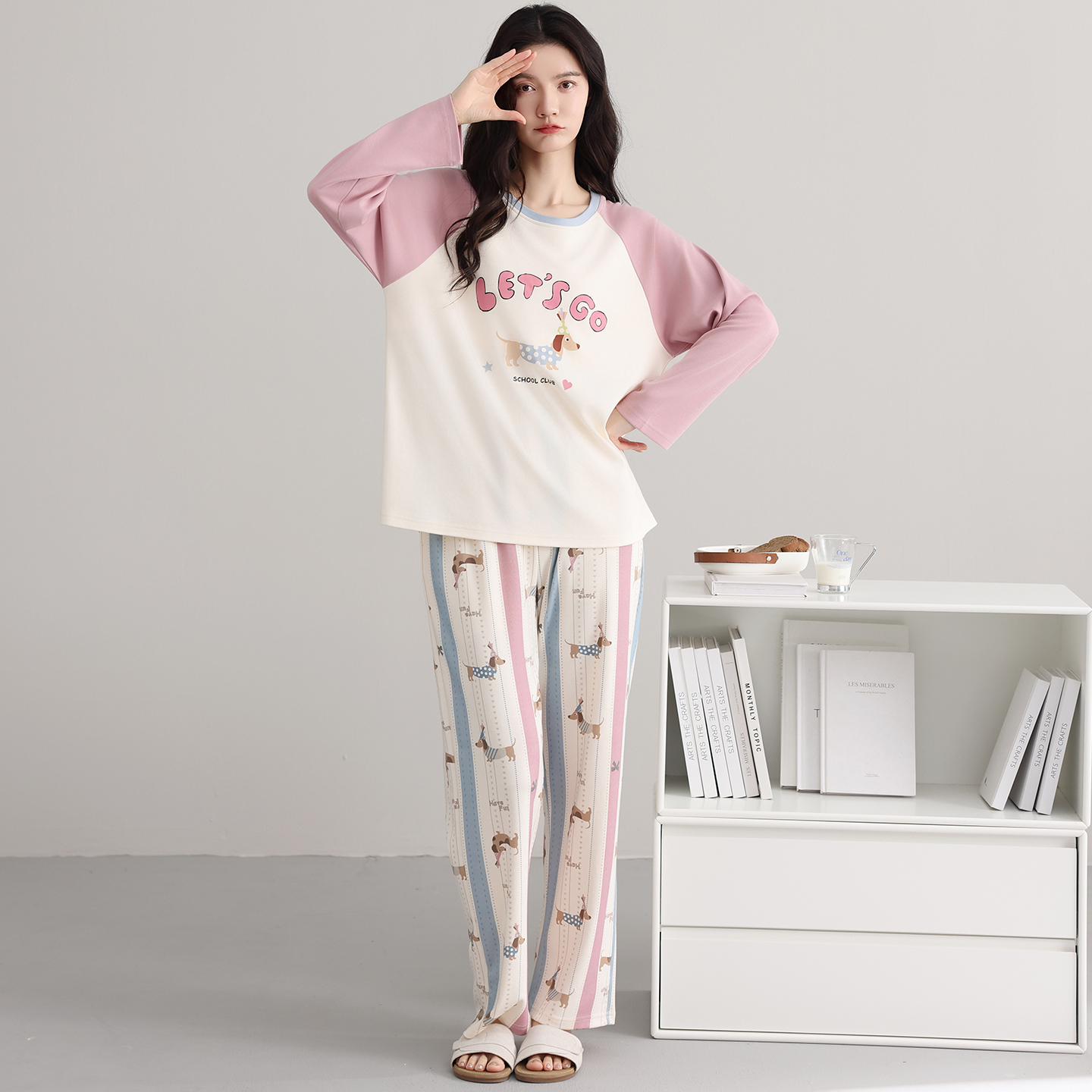 宜而爽卡通印花女士带胸垫纯棉睡衣休闲圆领宽松可外穿家居服套装