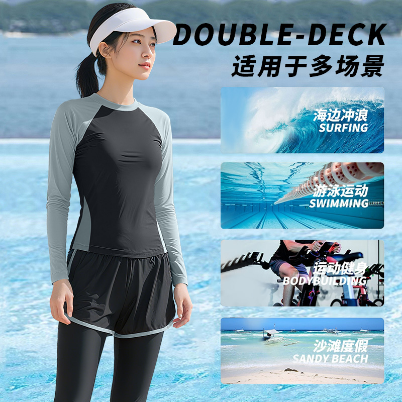 新款 长裤 防晒温泉女士带胸垫 长袖 泳衣女分体保守显瘦遮肉游泳套装