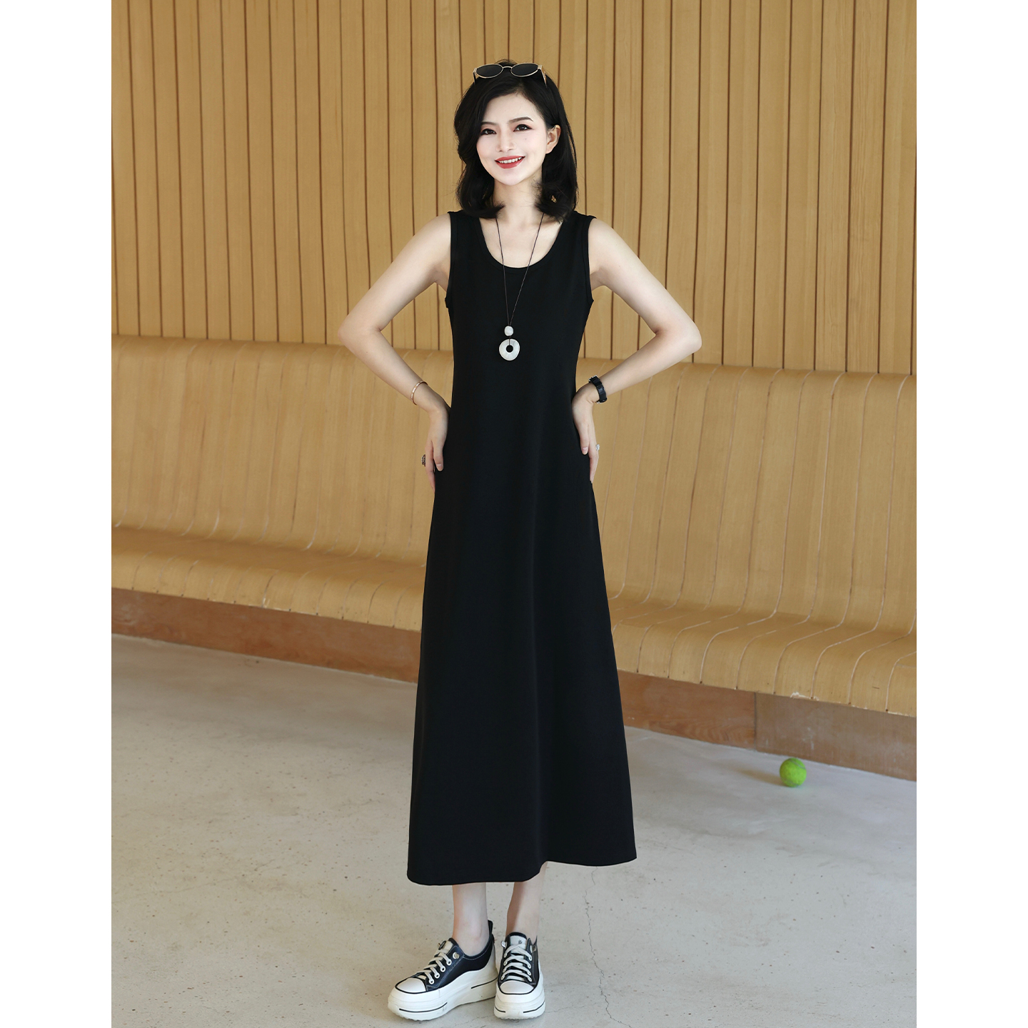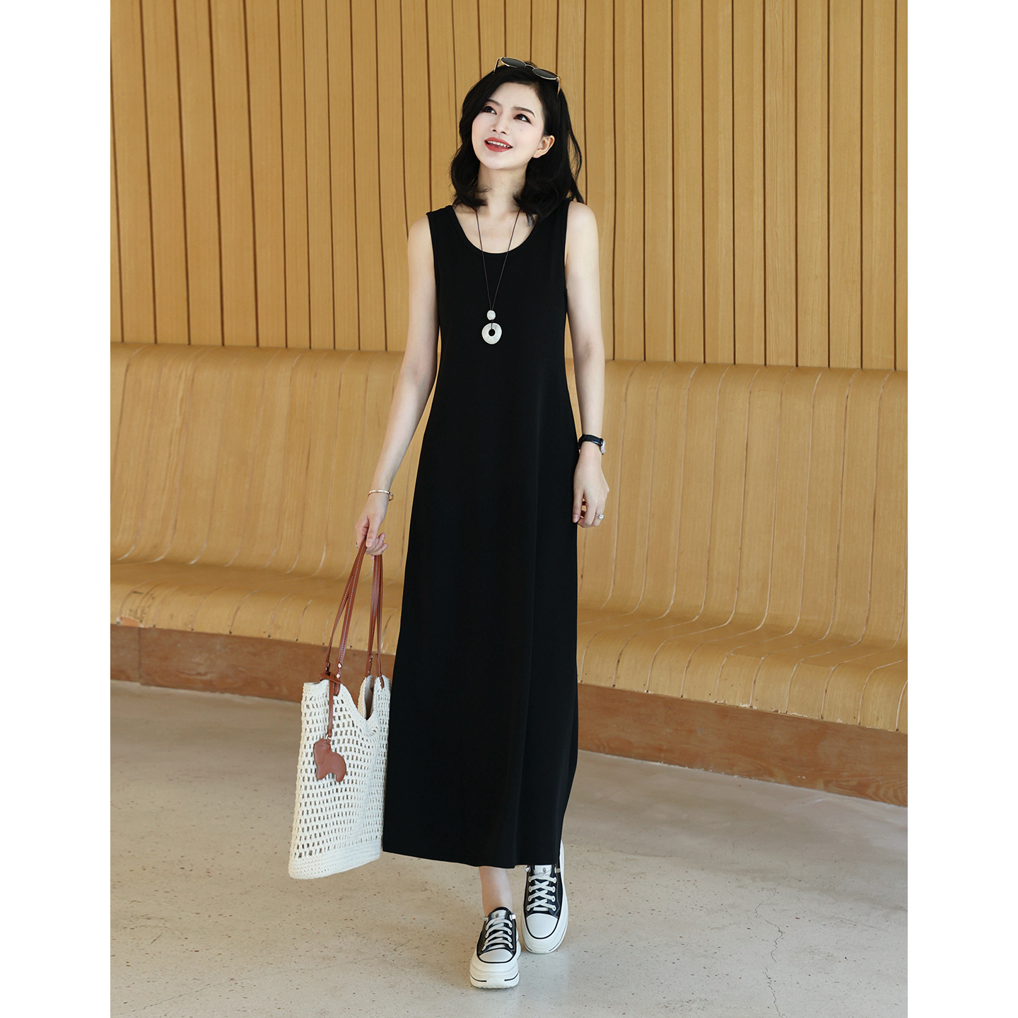 出游针织连衣裙女25秋季 枫竺U领无袖 垂感黑色长款 懒人背心裙