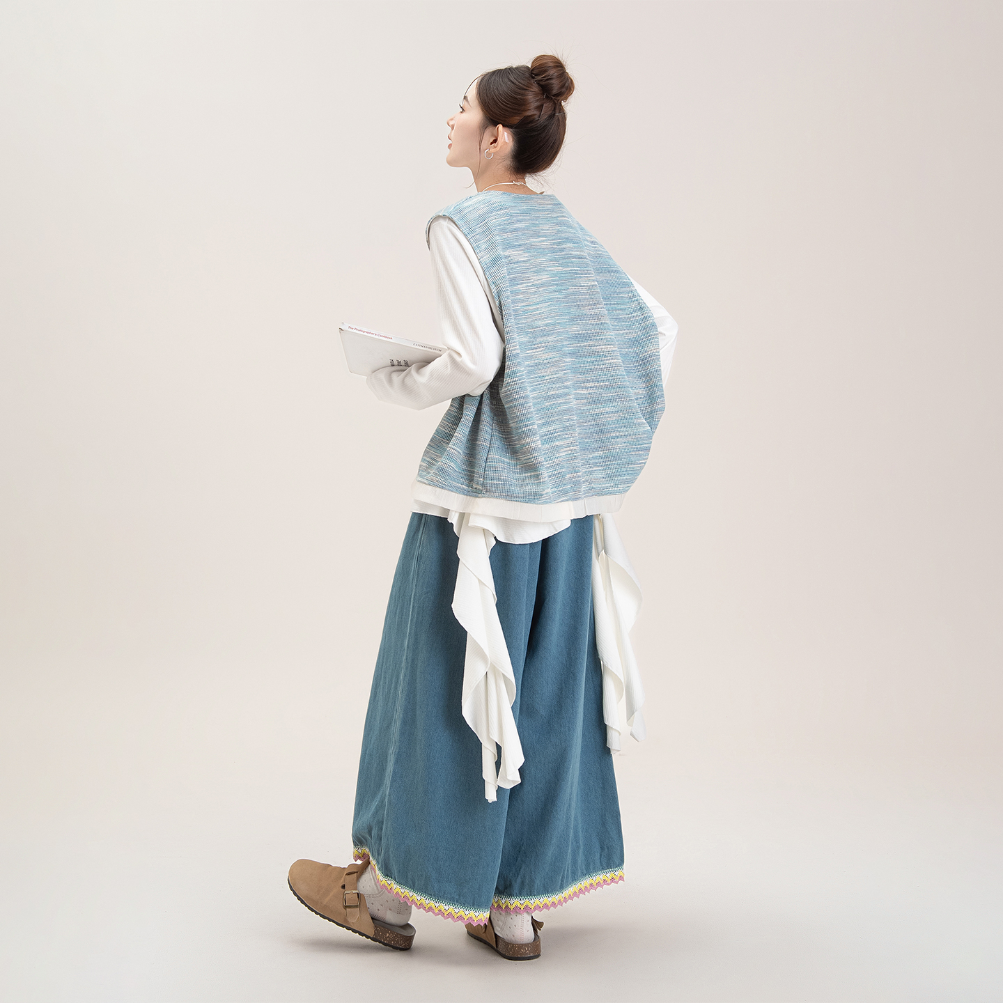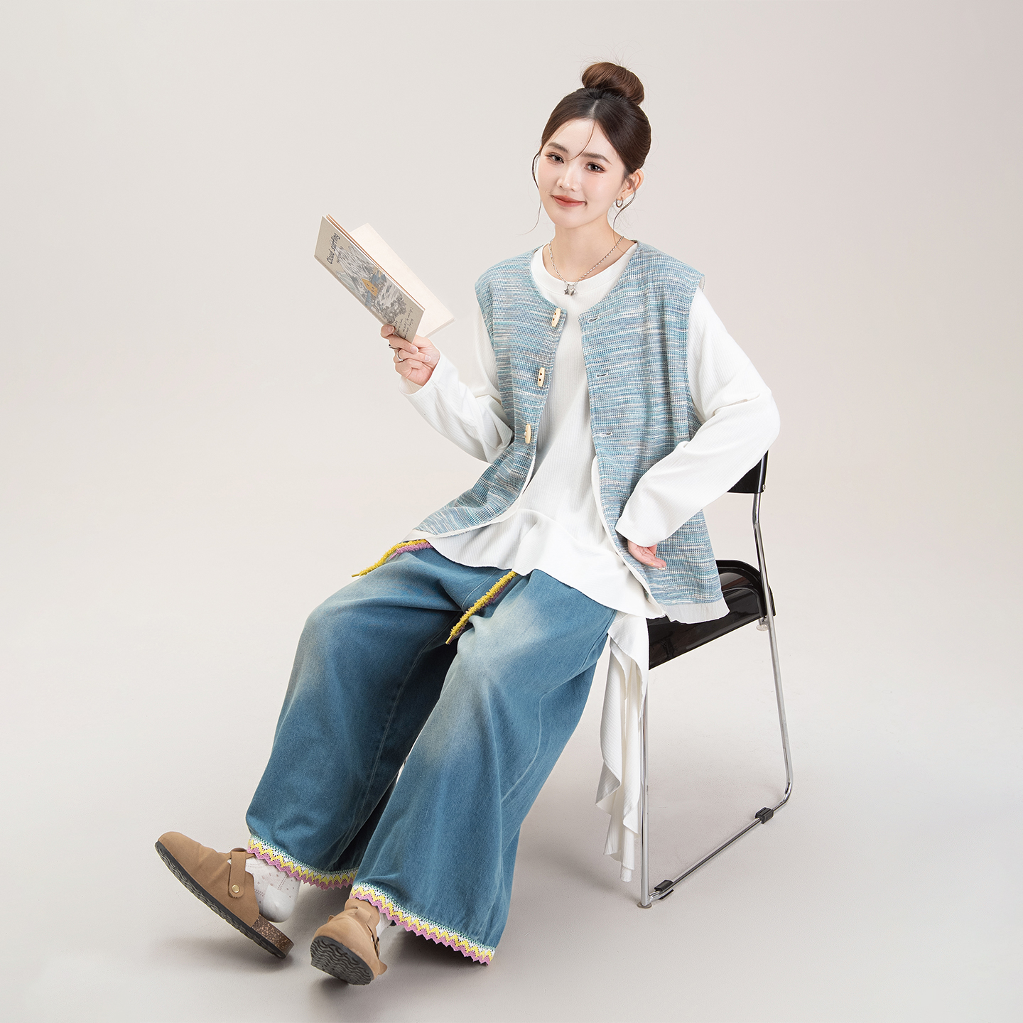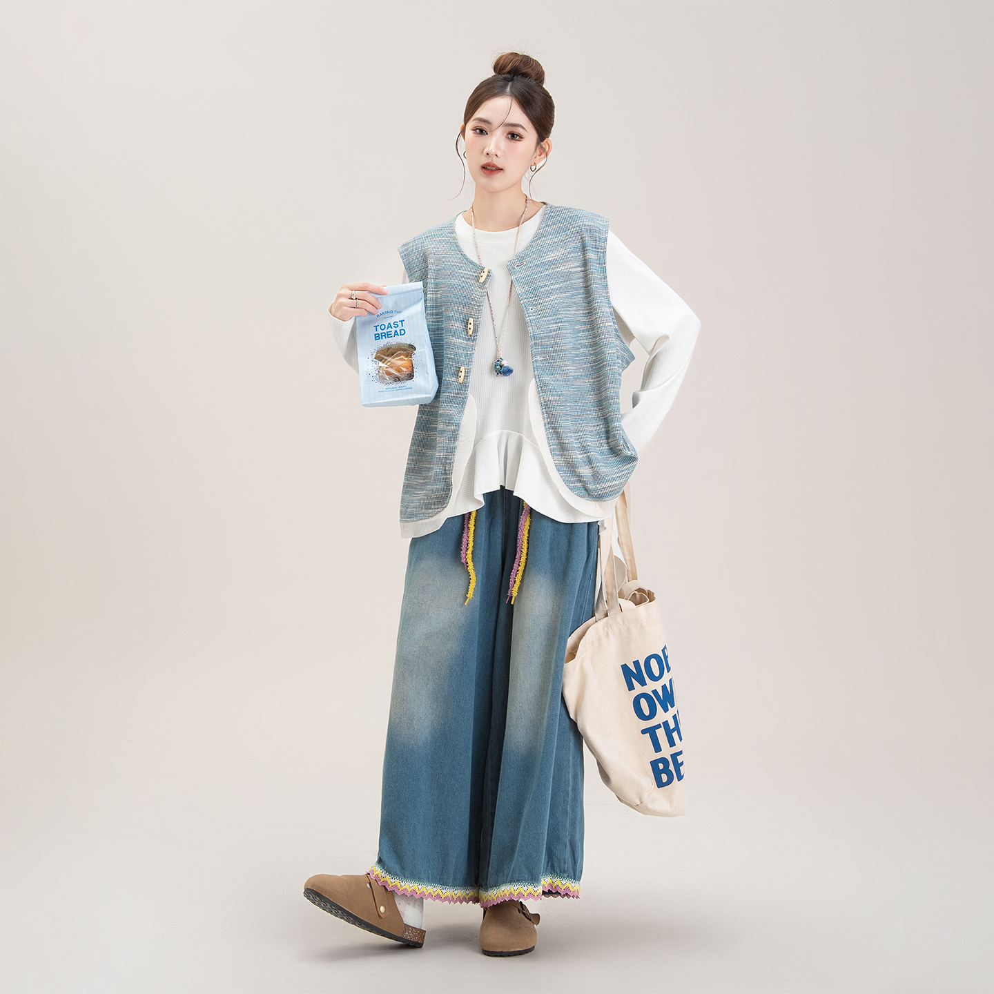 套装 白色不规则荷叶边T恤女早秋新款 叠穿马甲背心牛仔花边阔腿裤