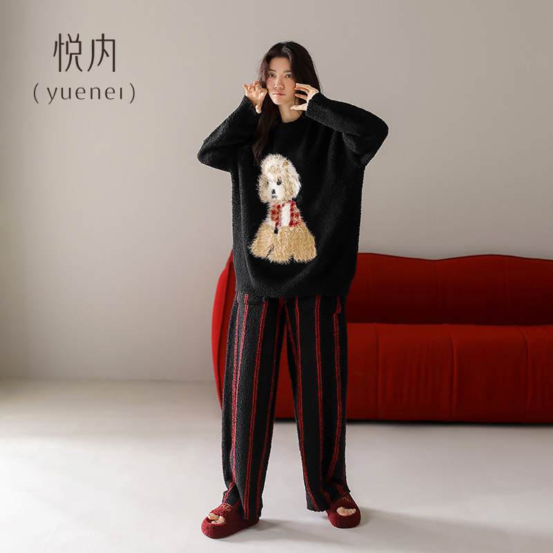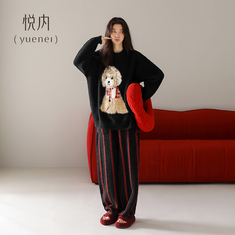 悦内半边绒睡衣女款 珊瑚绒家居服冬天保暖加厚加绒可爱小狗 秋冬季
