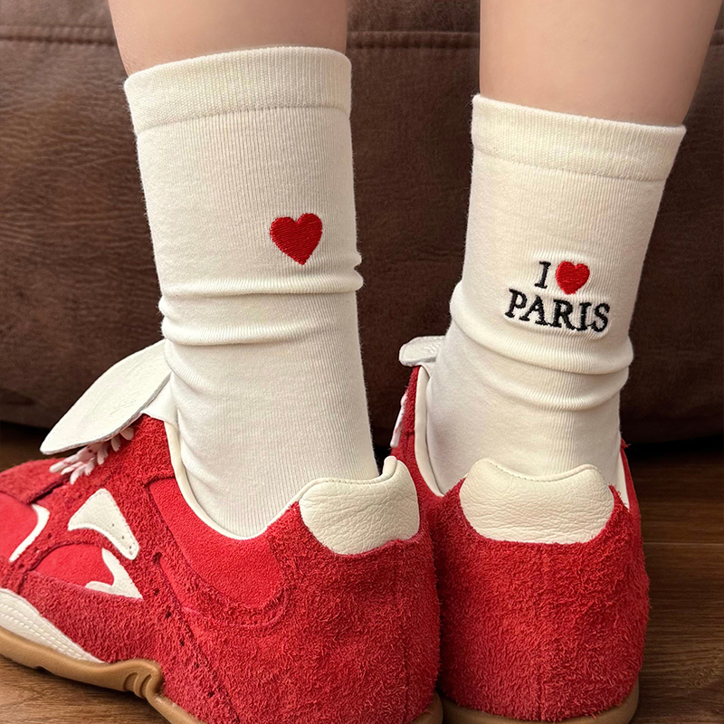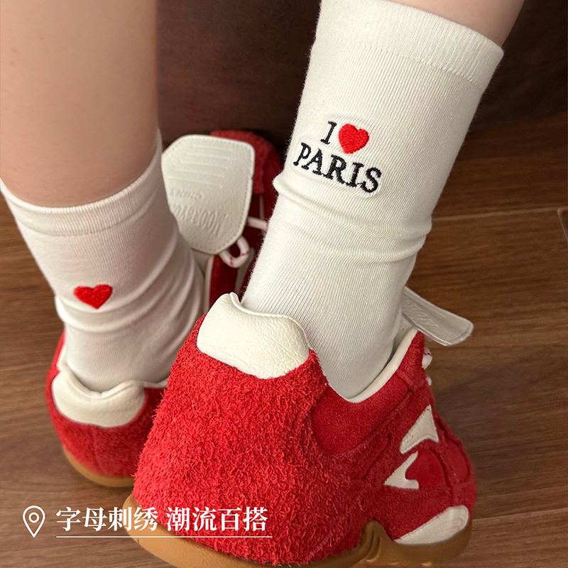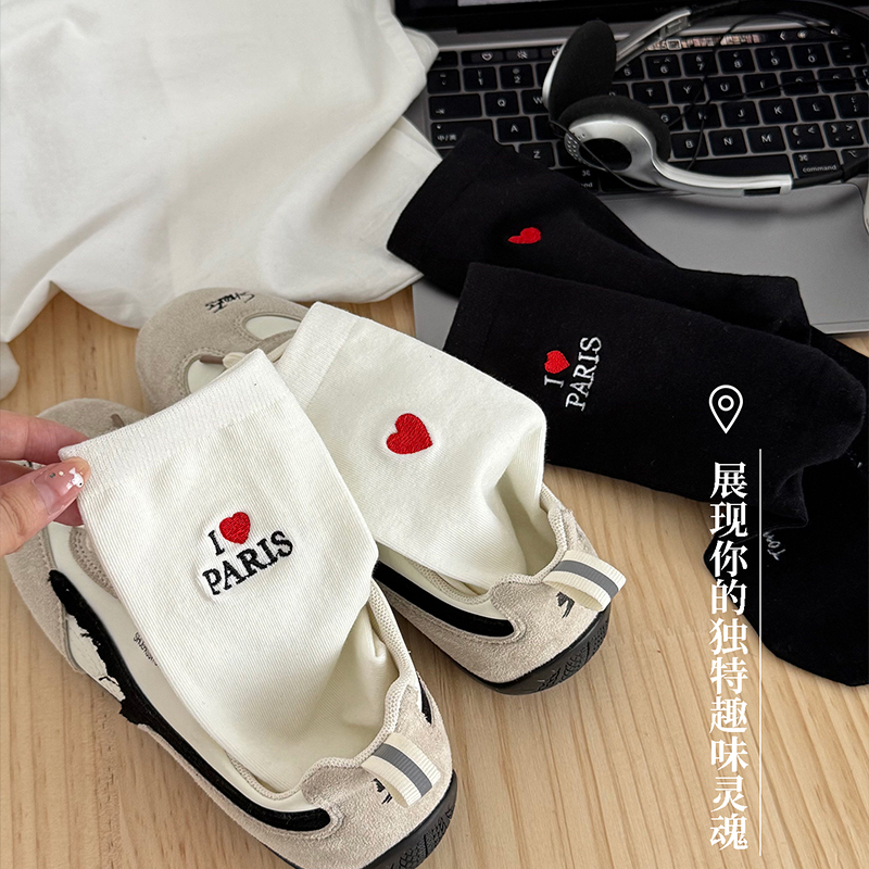 纯棉女中筒袜黑色 刺绣字母爱心堆堆袜2025秋冬韩系网红款 秋季 新款