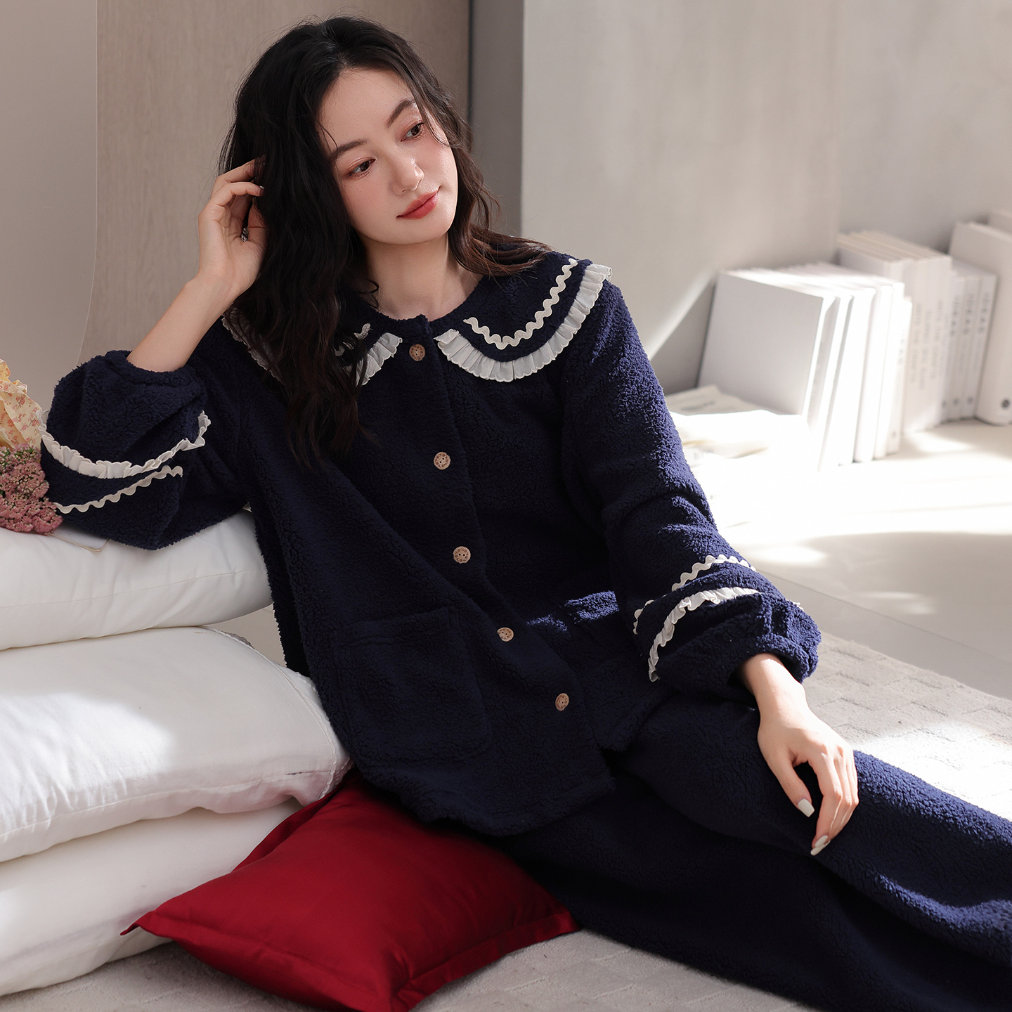 大码 春秋开衫 女士家居服 加厚珊瑚绒睡衣女冬法兰绒加绒套装 秋冬季