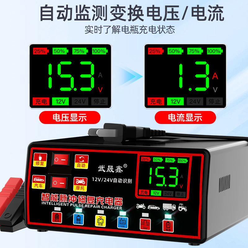 汽车电瓶充电器12v24v通用脉冲修复农用车三轮车摩托车蓄电池充电