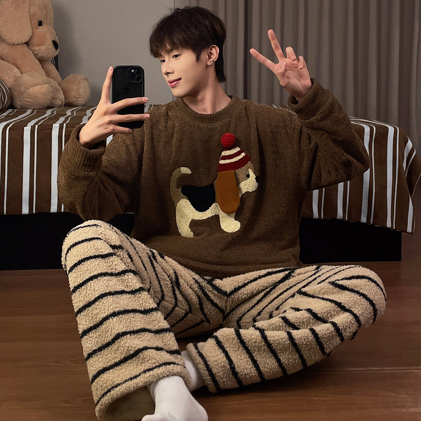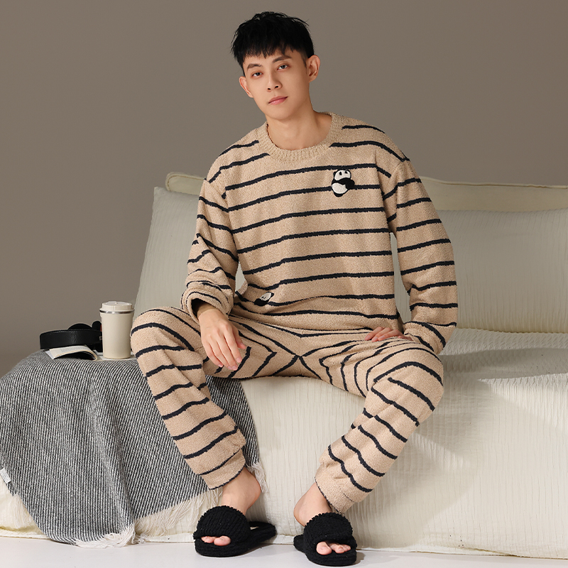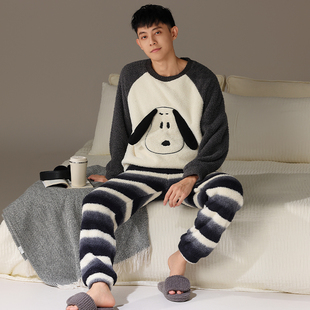 家居服套装 腊肠狗大码 珊瑚绒保暖青少年学生秋冬季 半边绒睡衣男款