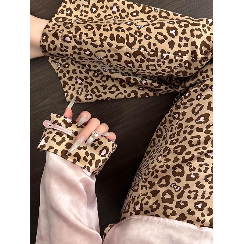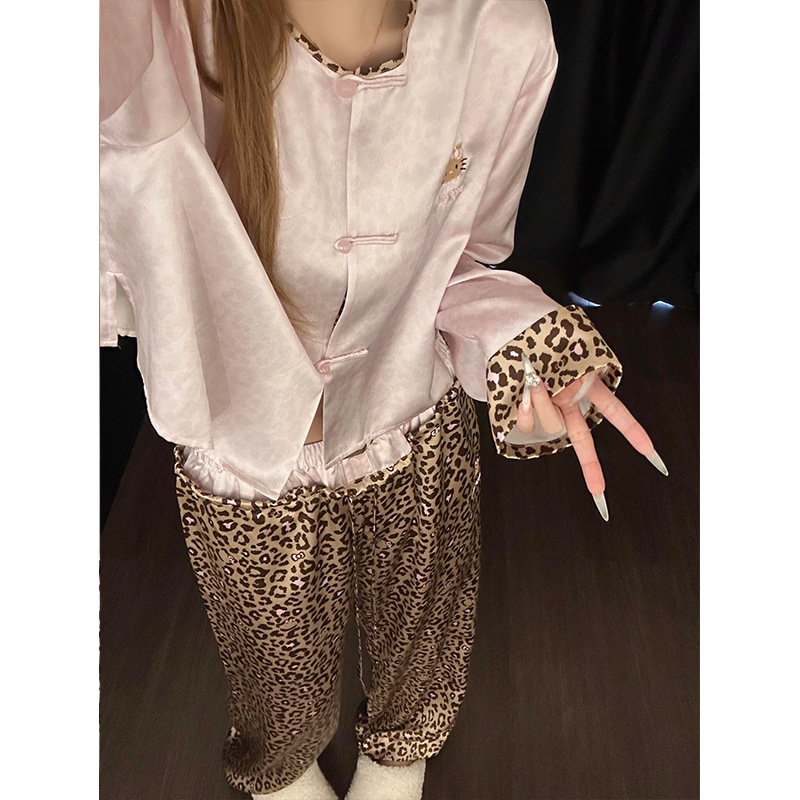 新款 春秋季 缎面粉色长袖 长裤 新中式 家居服套装 冰丝睡衣女款