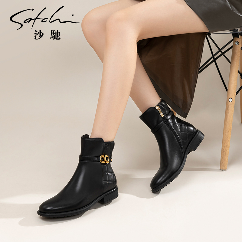 加绒保暖时装 新款 靴拉链真皮靴 粗跟通勤短靴2025冬季 沙驰女靴时尚