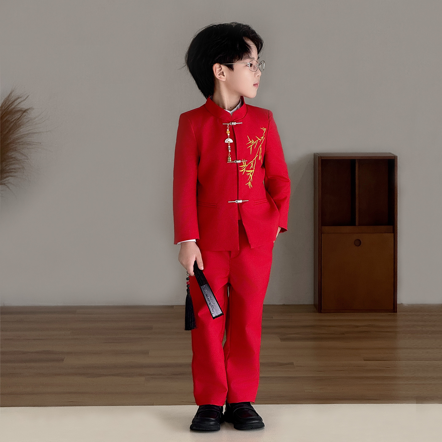 新款 2025秋季 红色立领刺绣小西服儿童演出服 国风中山装 男童新中式