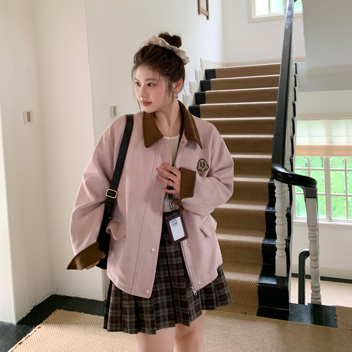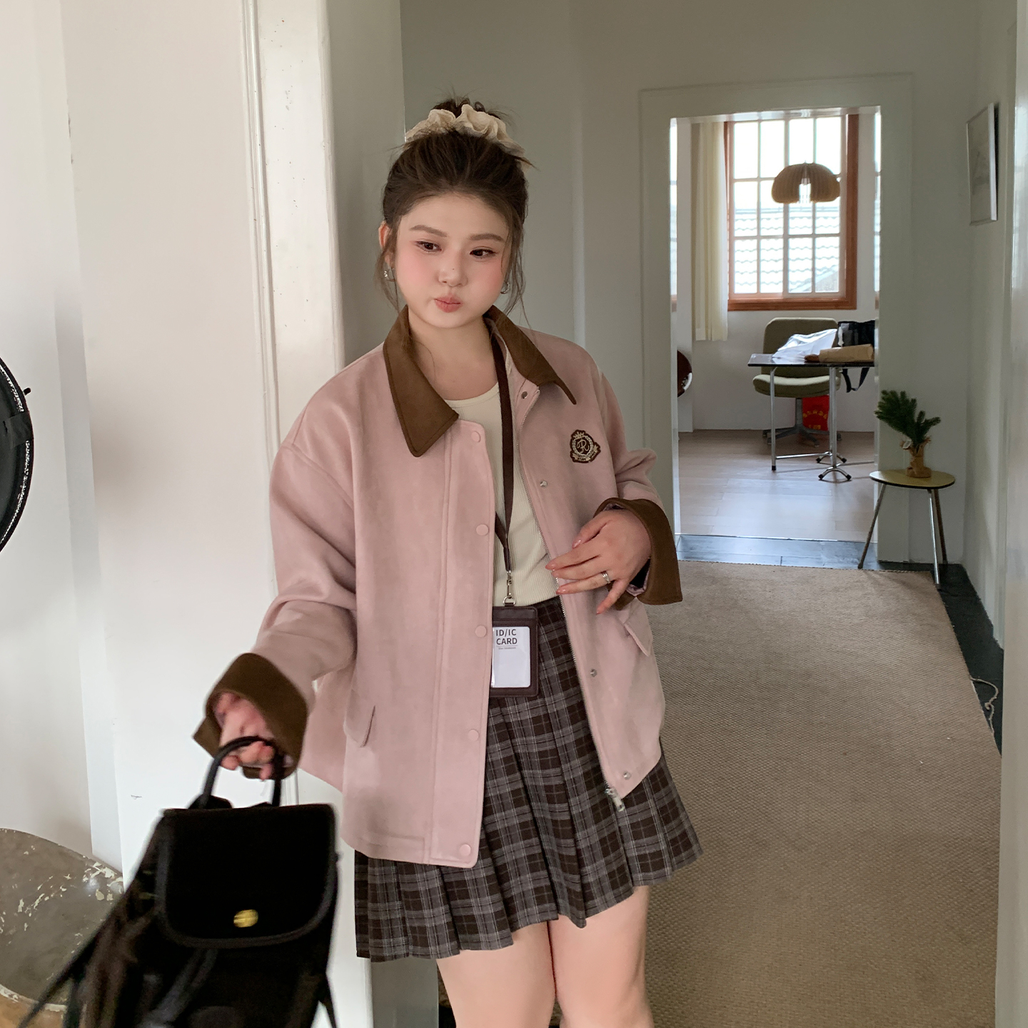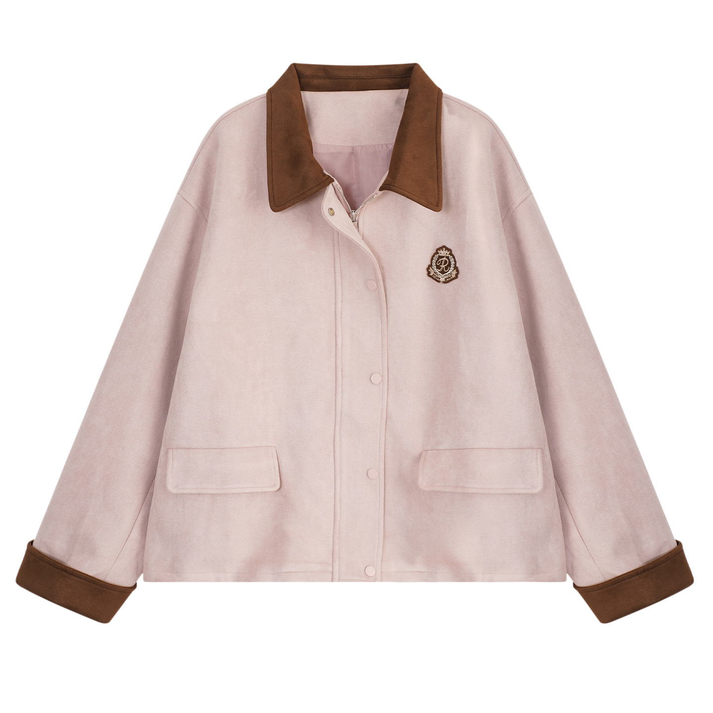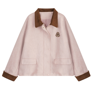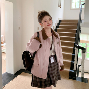 YUZI鱼子粉色麂皮外套大码 甜酷复古学院风宽松撞色秋冬胖mm 女装