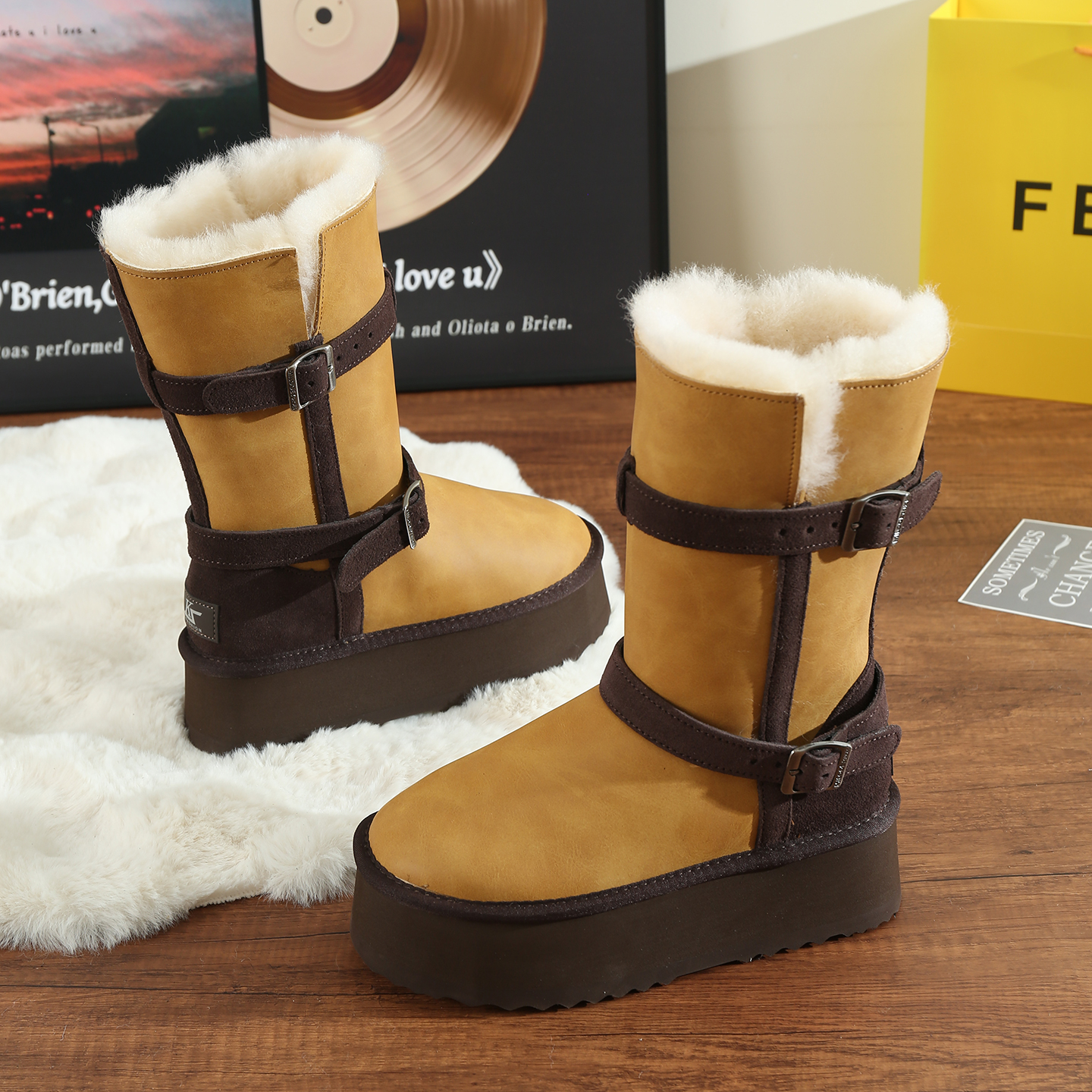 防寒雪地靴女中筒皮带扣25年冬季 皮毛一体靴女防水套筒羊毛靴 新款