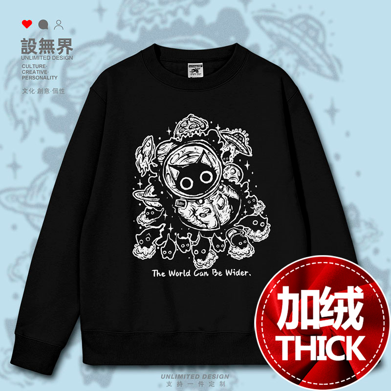 无界 潮设 卡通可爱黑猫宇航员太空插画连帽卫衣男女个性 创意帽衫