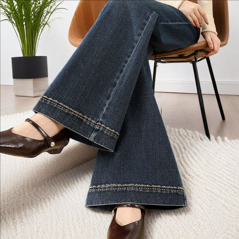 松驰感阔腿牛仔裤 新款 夏 女2025秋季 阔色条纹花边蓝色休闲直筒长裤