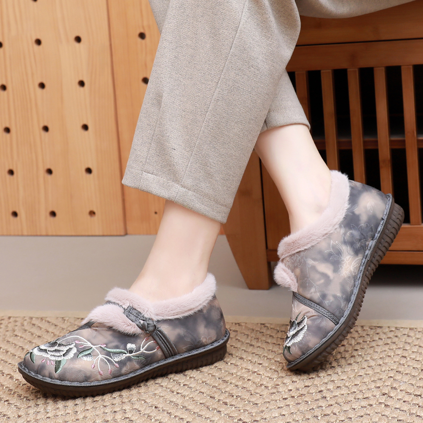 毛毛鞋 冬季 民族风加绒保暖中老年人妈妈鞋 女士绣花棉鞋 老北京布鞋