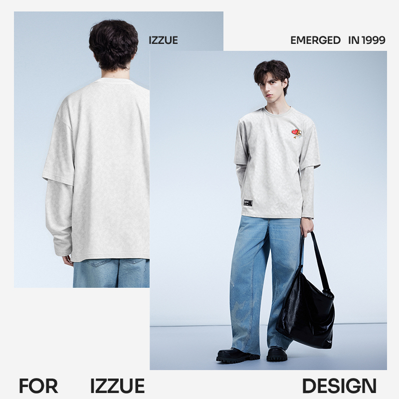 T恤男2025年春秋宽松蜡染打底衫 izzue原创潮牌假两件圆领长袖
