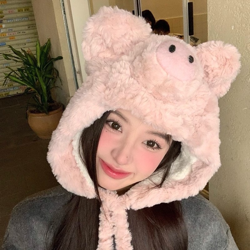可爱卡通粉色猪包头玩偶帽子女秋冬季 护耳保暖防寒雷锋帽 2025新款