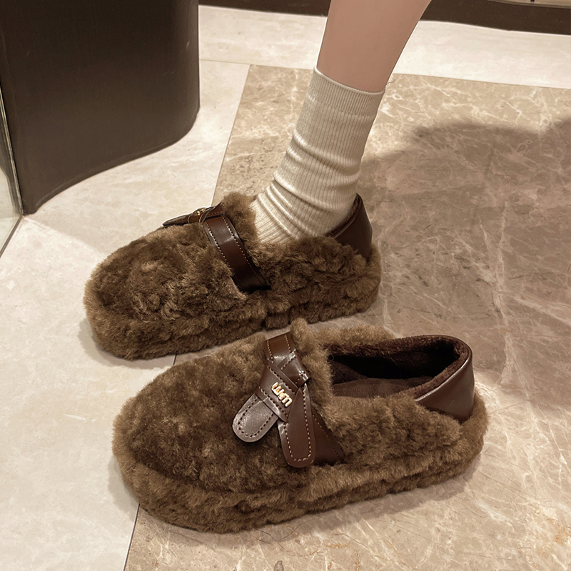 保暖棉鞋 高级羊羔毛毛鞋 一脚蹬豆豆鞋 新款 女黑色厚底增高2025冬季