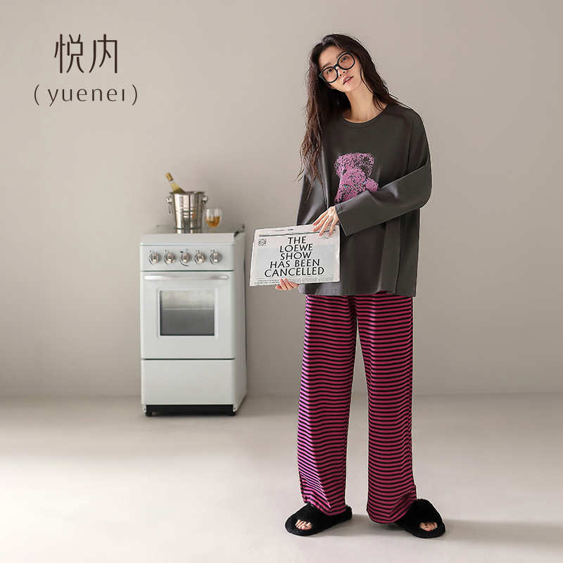 家居服宽松大码 纯棉长袖 卡通熊可外穿 秋季 悦内带胸垫睡衣女春秋款