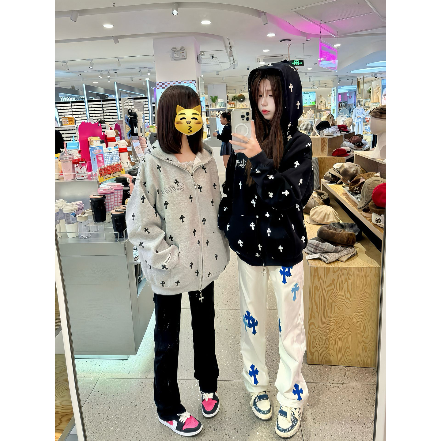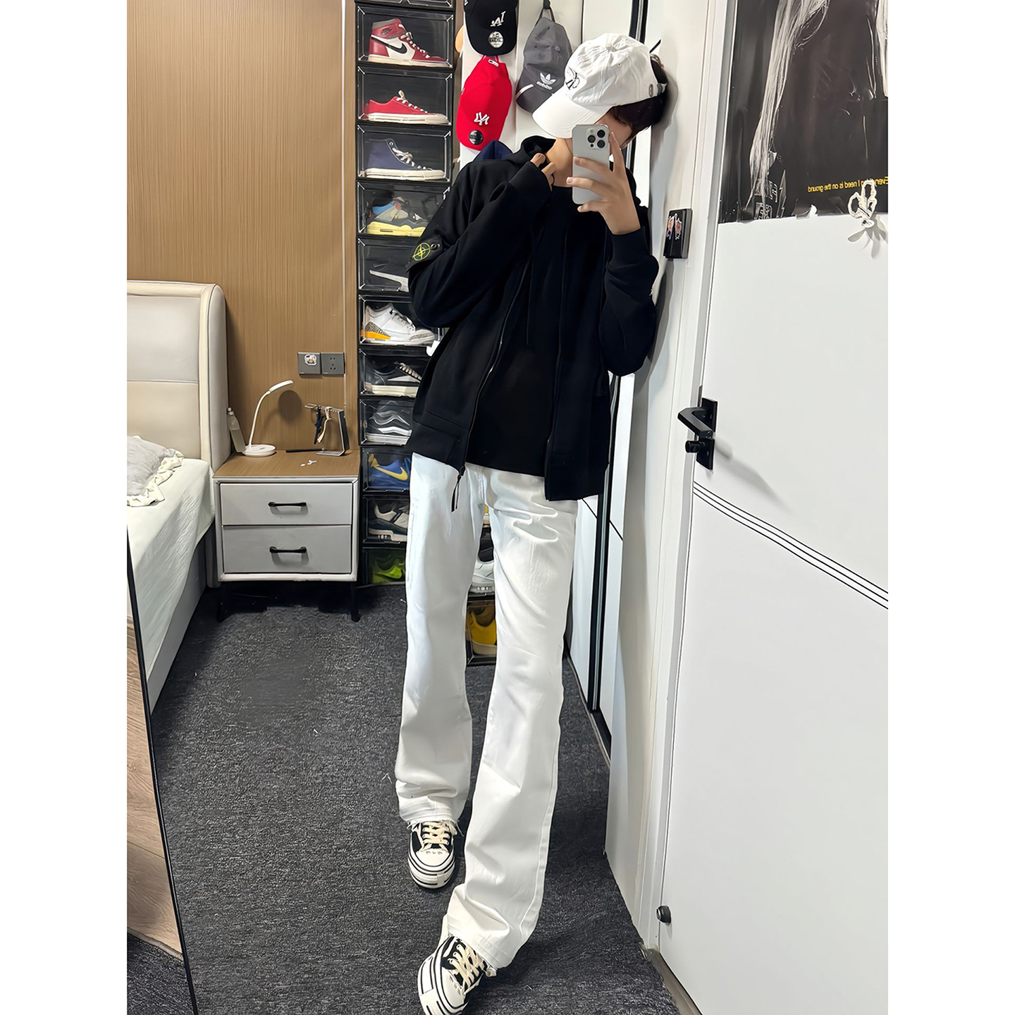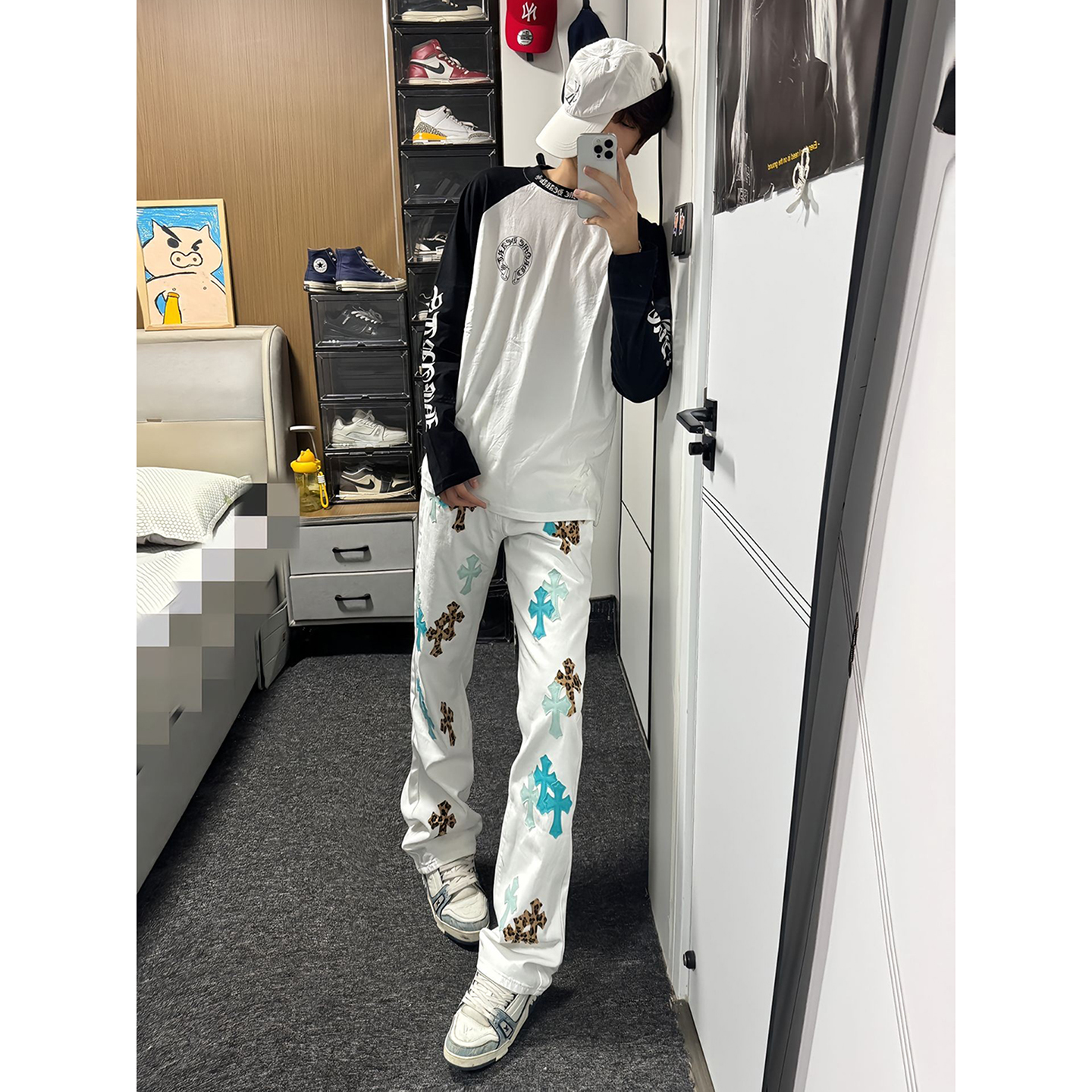 潮牌宽松阔腿直筒休闲长裤 男女新款 子 复古简约白色弯刀牛仔裤 美式