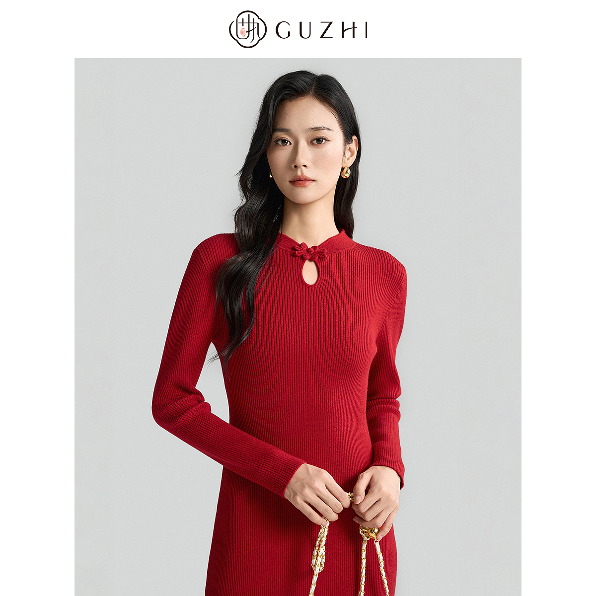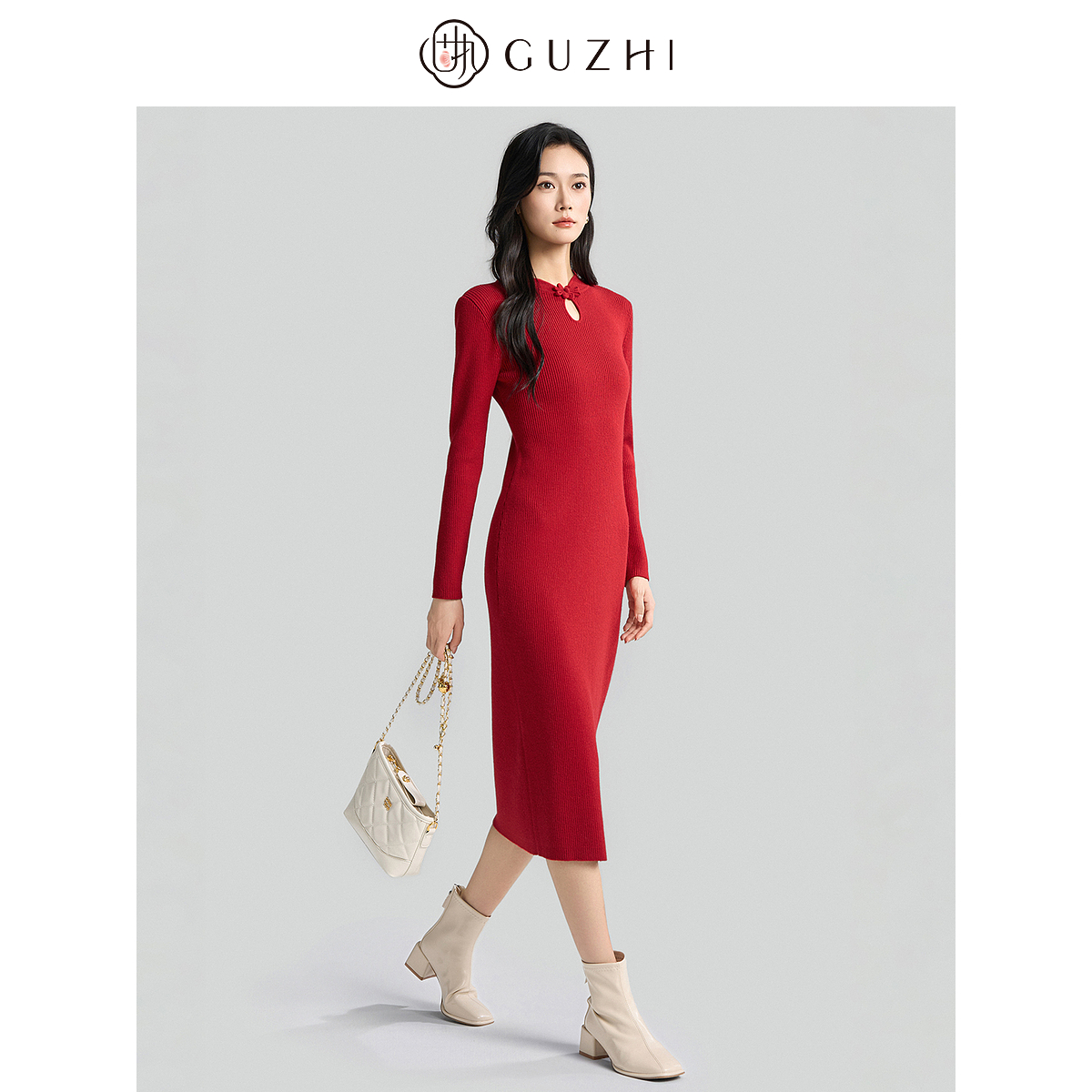 中长款 高端优雅轻熟气质修身 裙子 新款 菲梦伊钉珠红色连衣裙女秋装