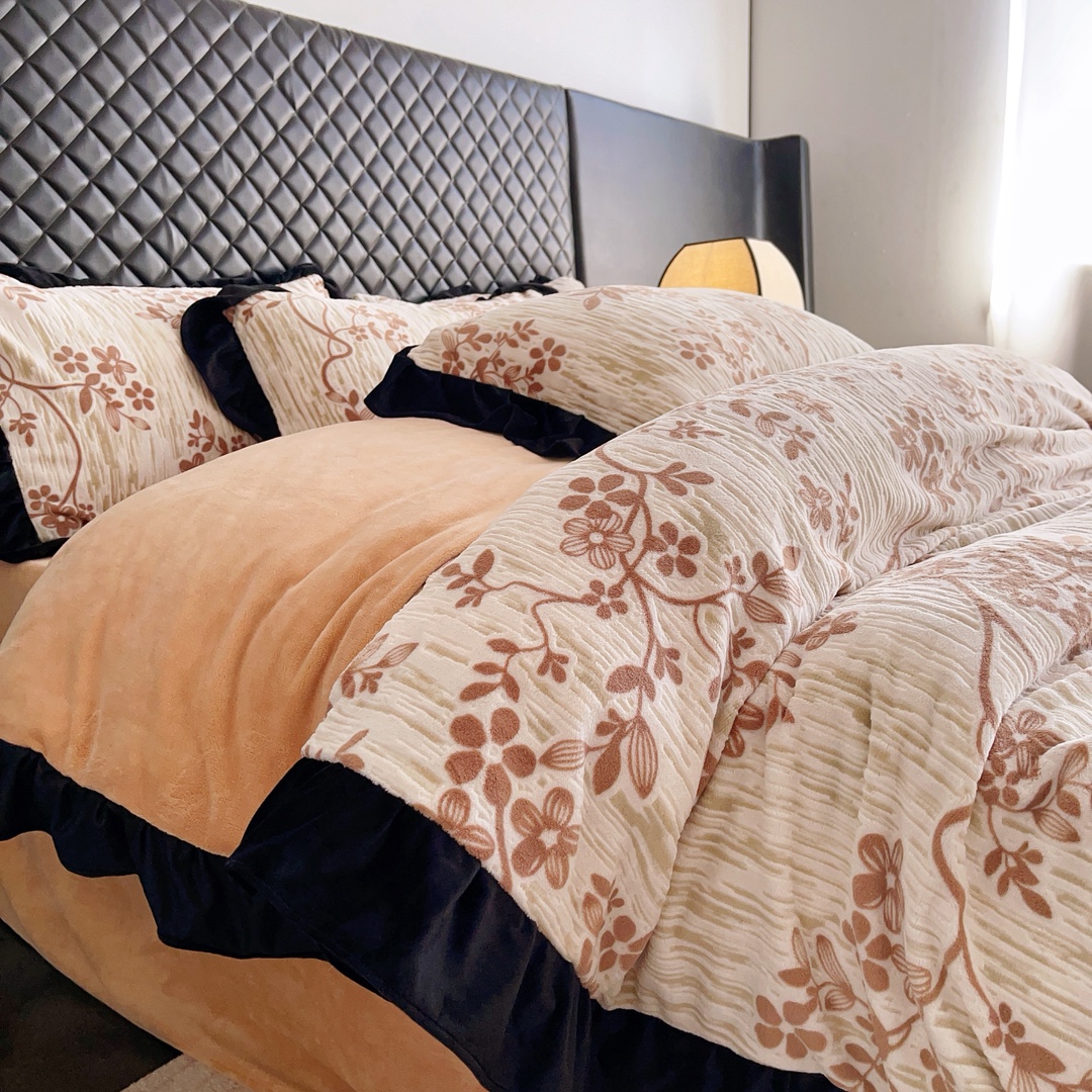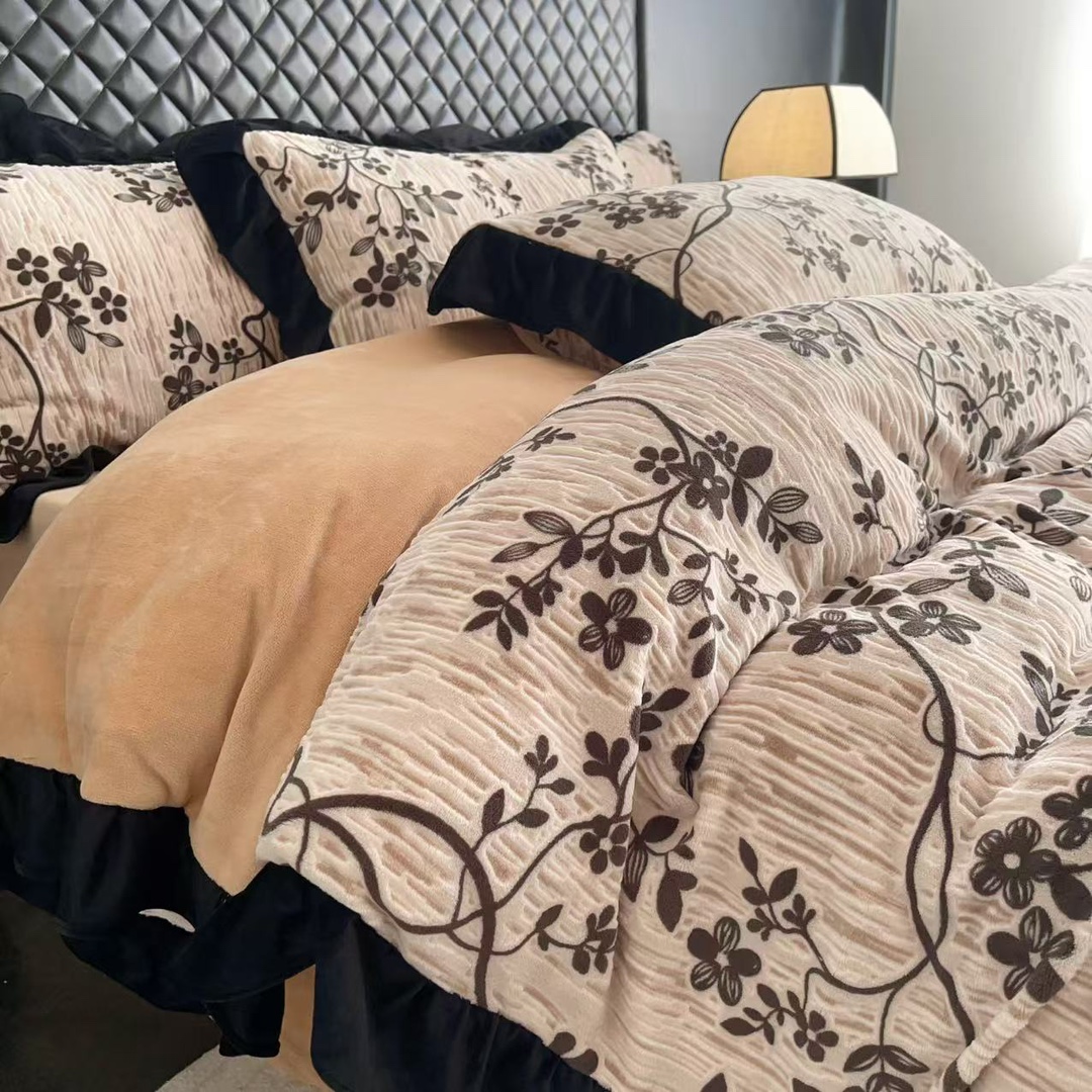 复古赫本风高克重立体浮雕牛奶绒四件套韩版 花边珊瑚绒床单被套罩