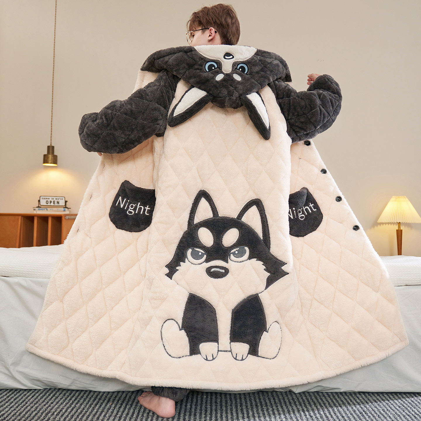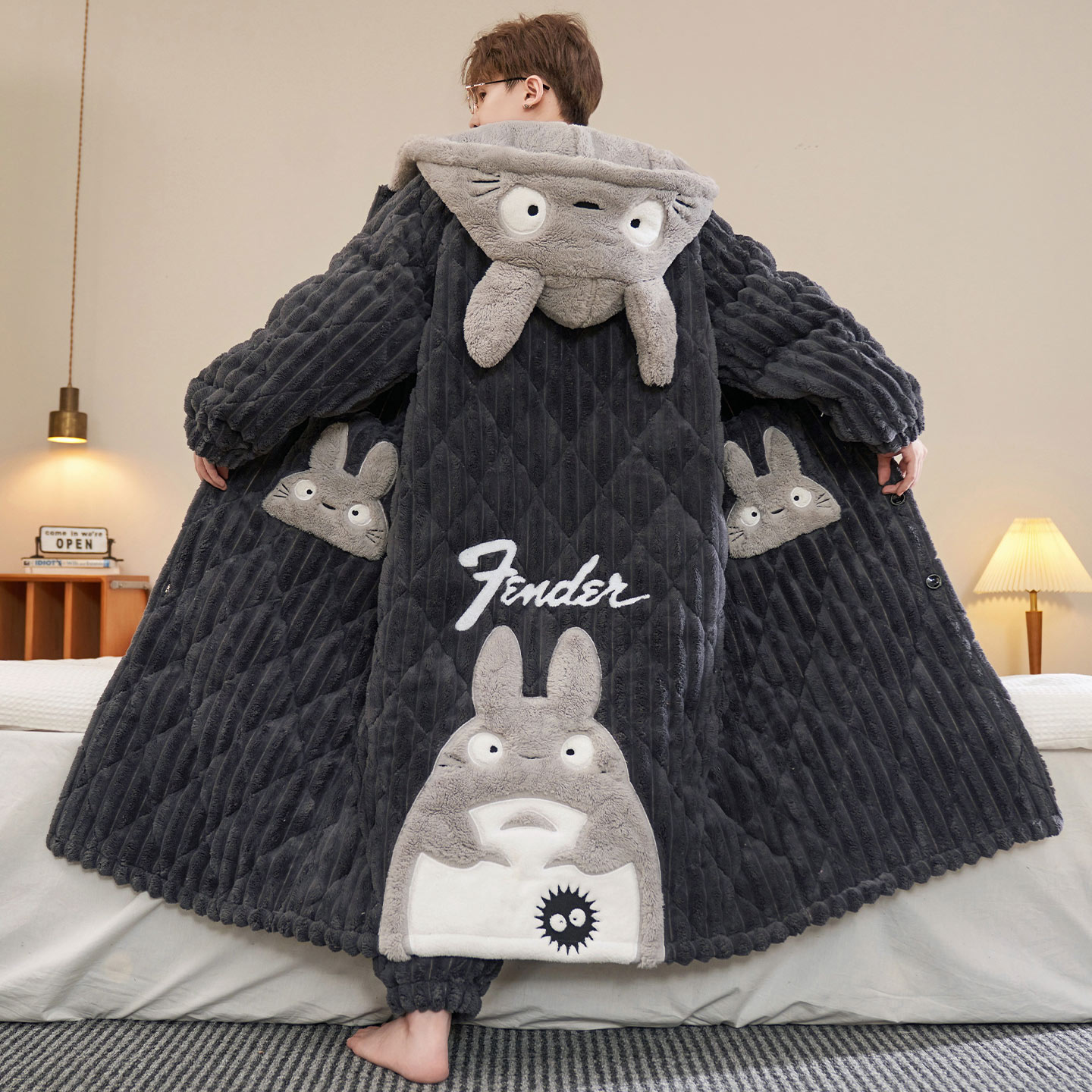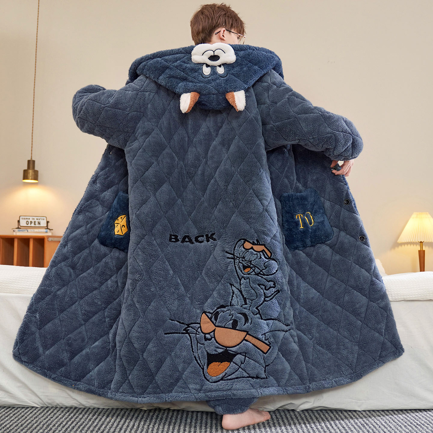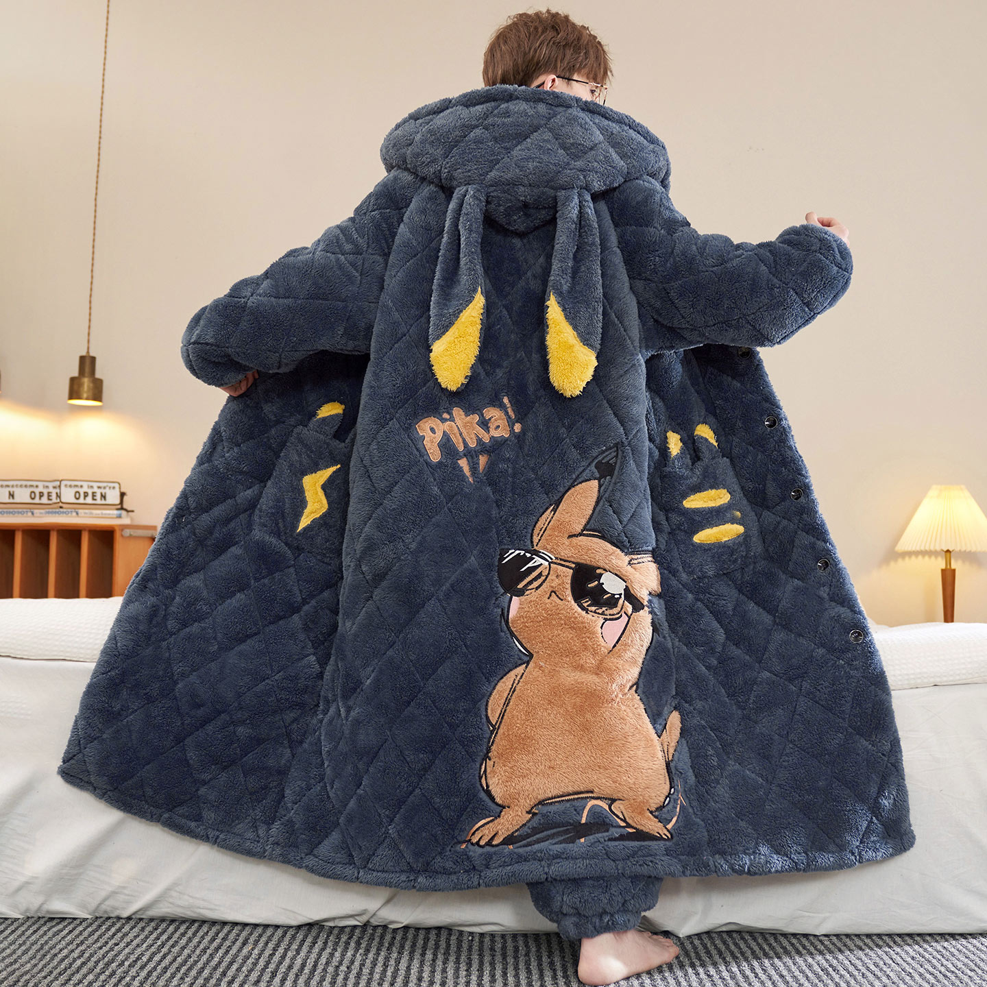 秋冬季 睡衣男孩保暖熊猫家居服 睡袍男三层夹棉珊瑚绒加厚加绒冬款