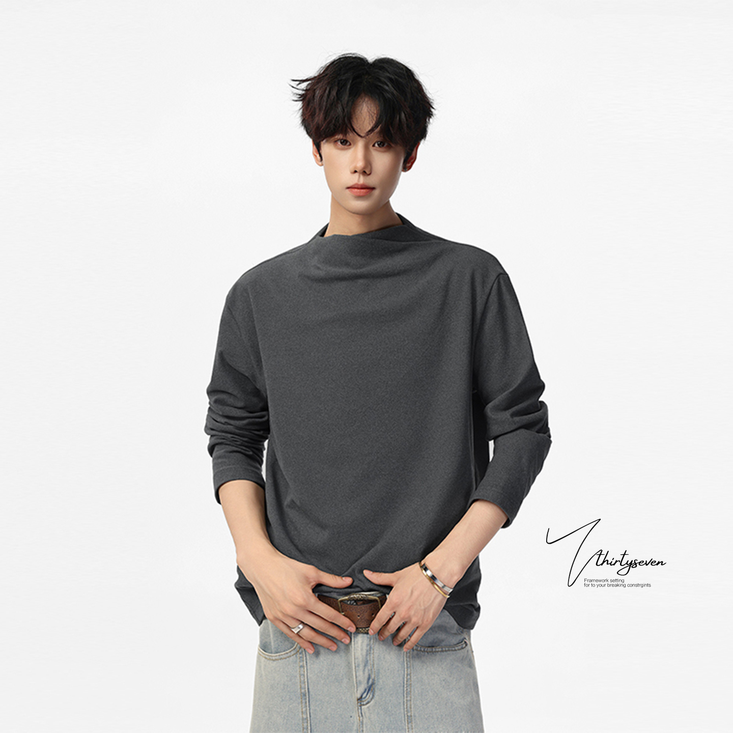 修身 男秋季 通勤内搭青少年半高领上衣潮 咖色双层荡领长袖 V37美式