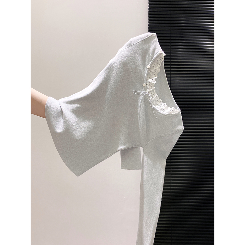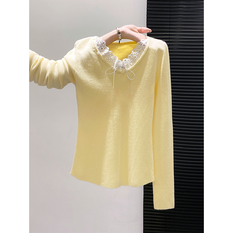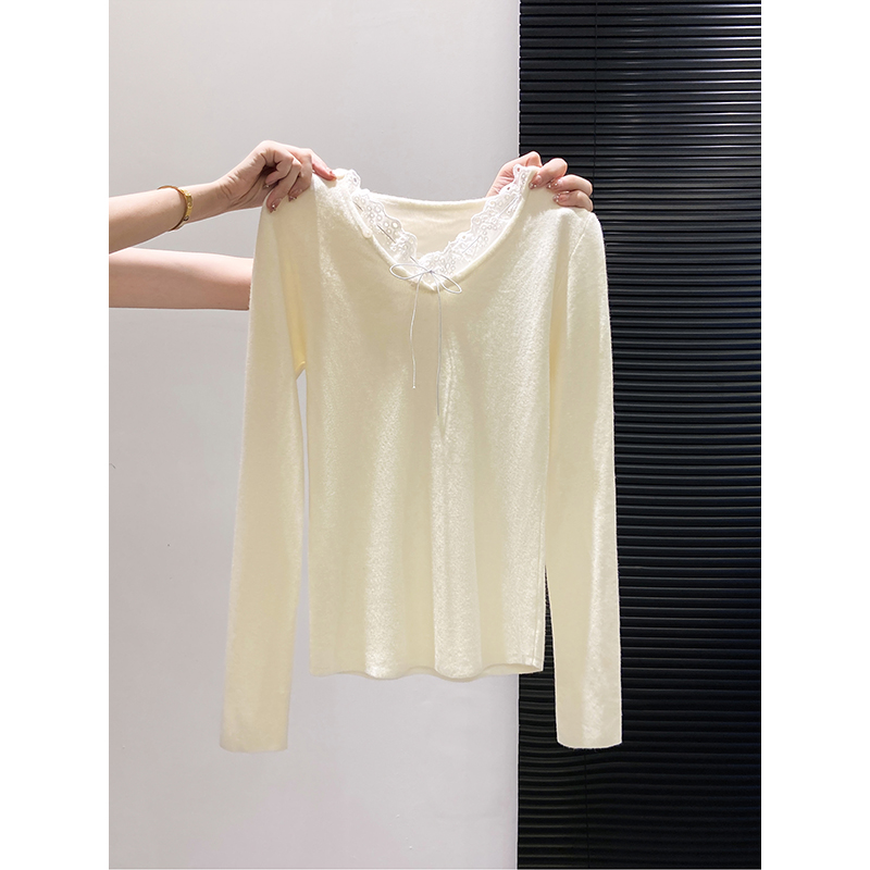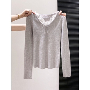 显瘦小众内搭打底上衣 修身 蓝色蕾丝拼接V领针织衫 女2025早秋新款
