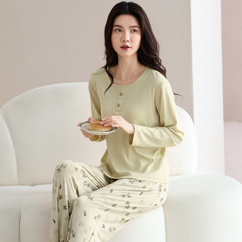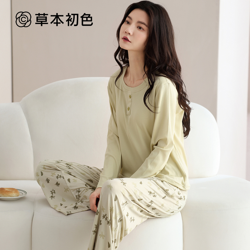 草本初色带胸垫100%纯棉免穿文胸长袖 可外穿睡衣女士家居服套装