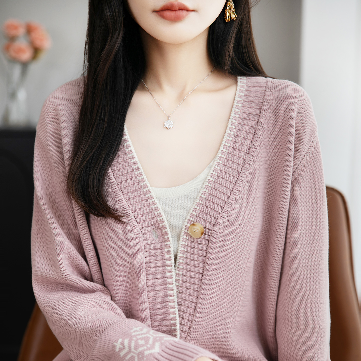 复古提花V领100%纯棉毛衣开衫 宽松百搭外套上衣女 女外搭洋气大码