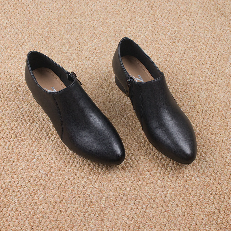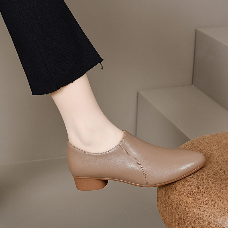 尖头粗跟软底复古百搭皮鞋 新款 女春秋季 软皮深口低跟棕色气质单鞋