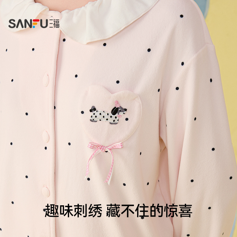 家居服507767 甜美宽松抗静电长袖 三福女冬季 荷叶领波点睡衣套装