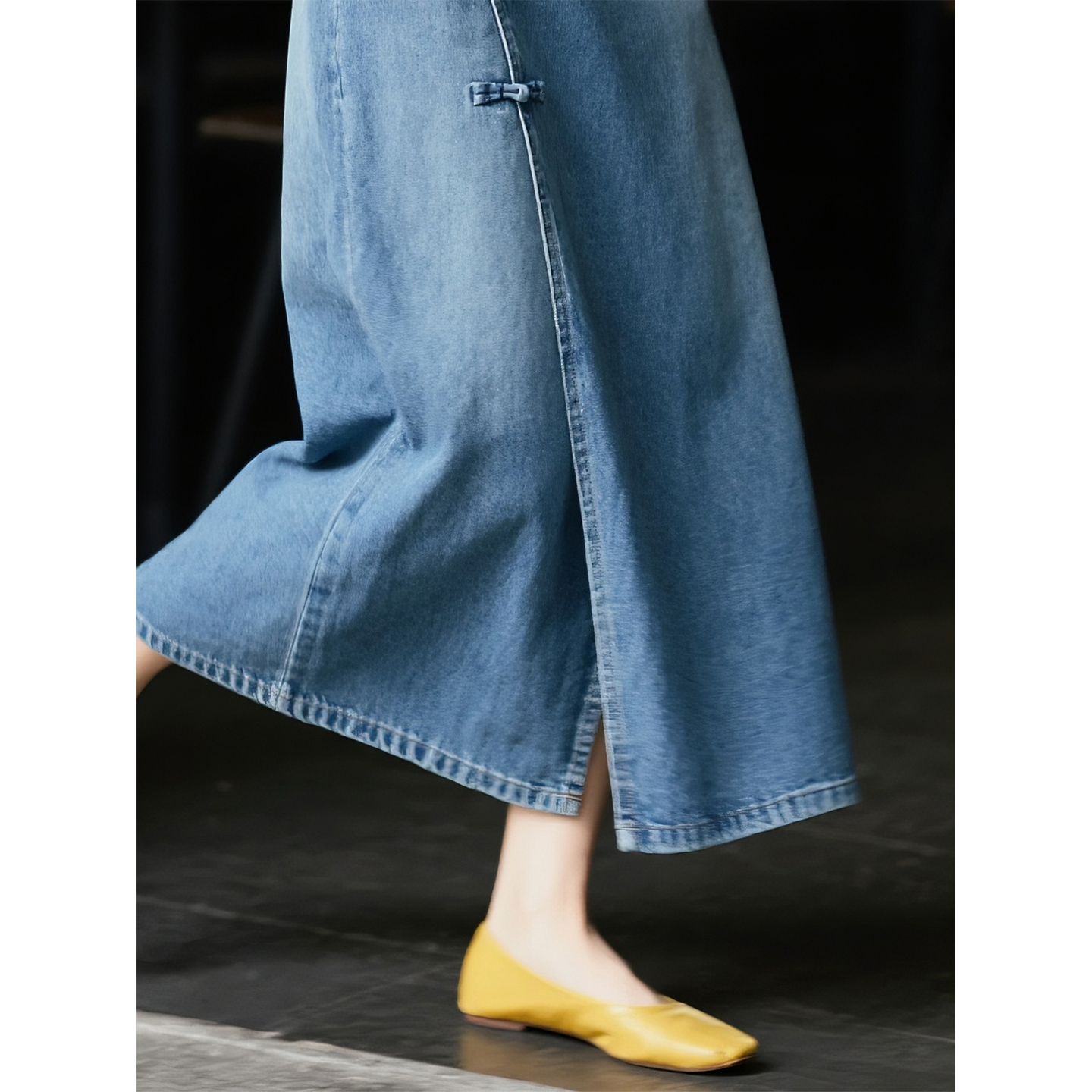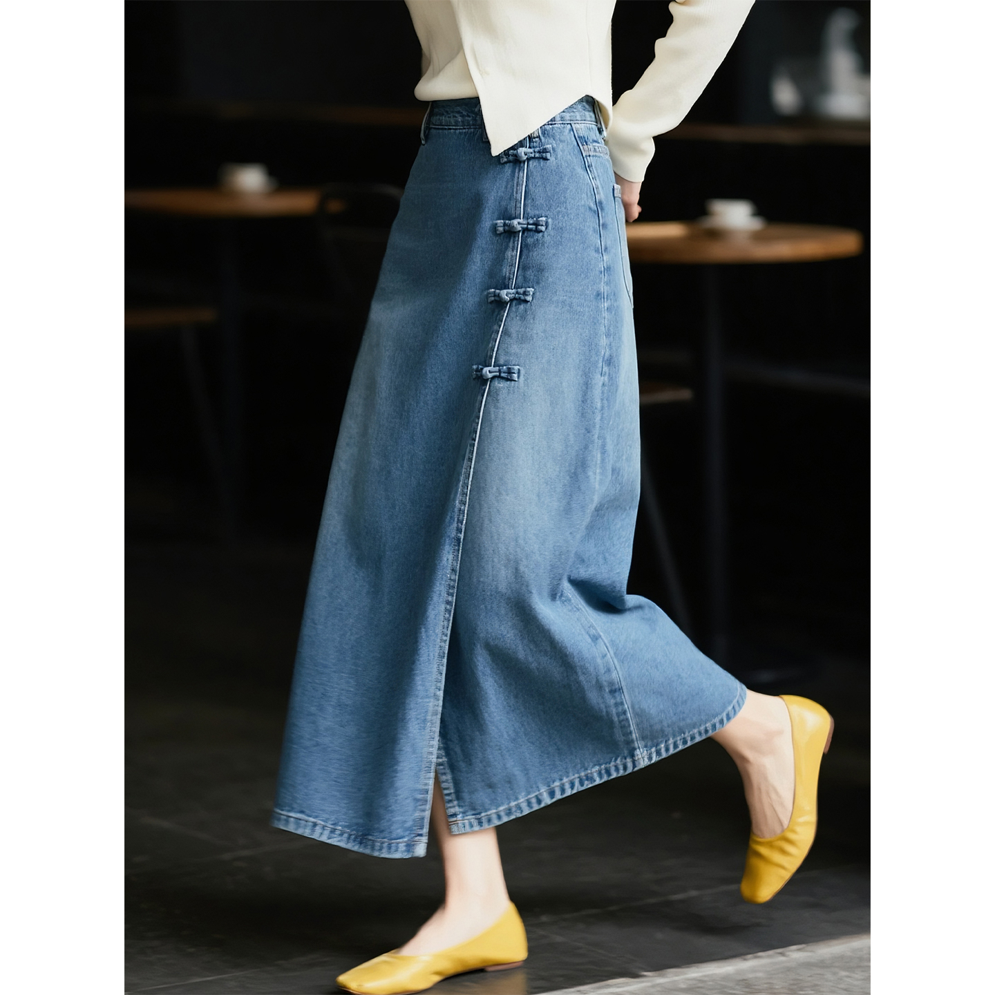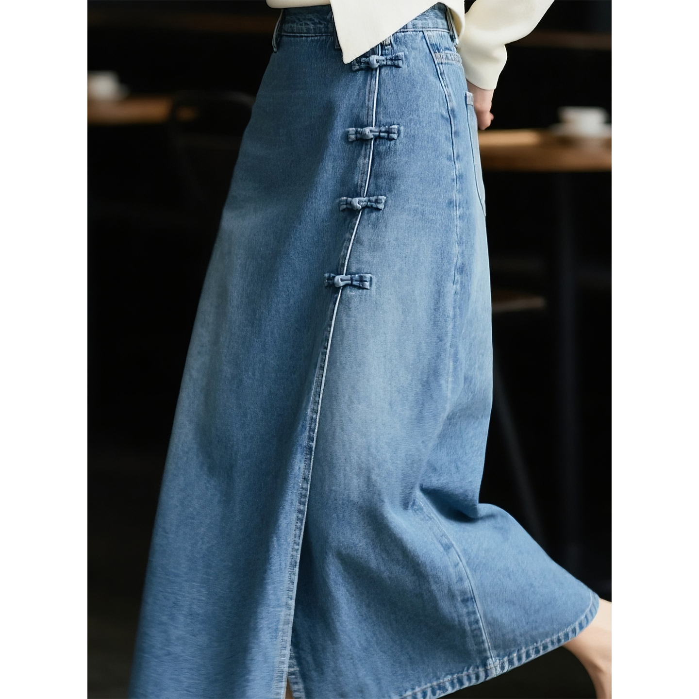 国风盘扣高腰开叉a字裙 新中式 复古蓝牛仔半身裙女2025年秋季 新款