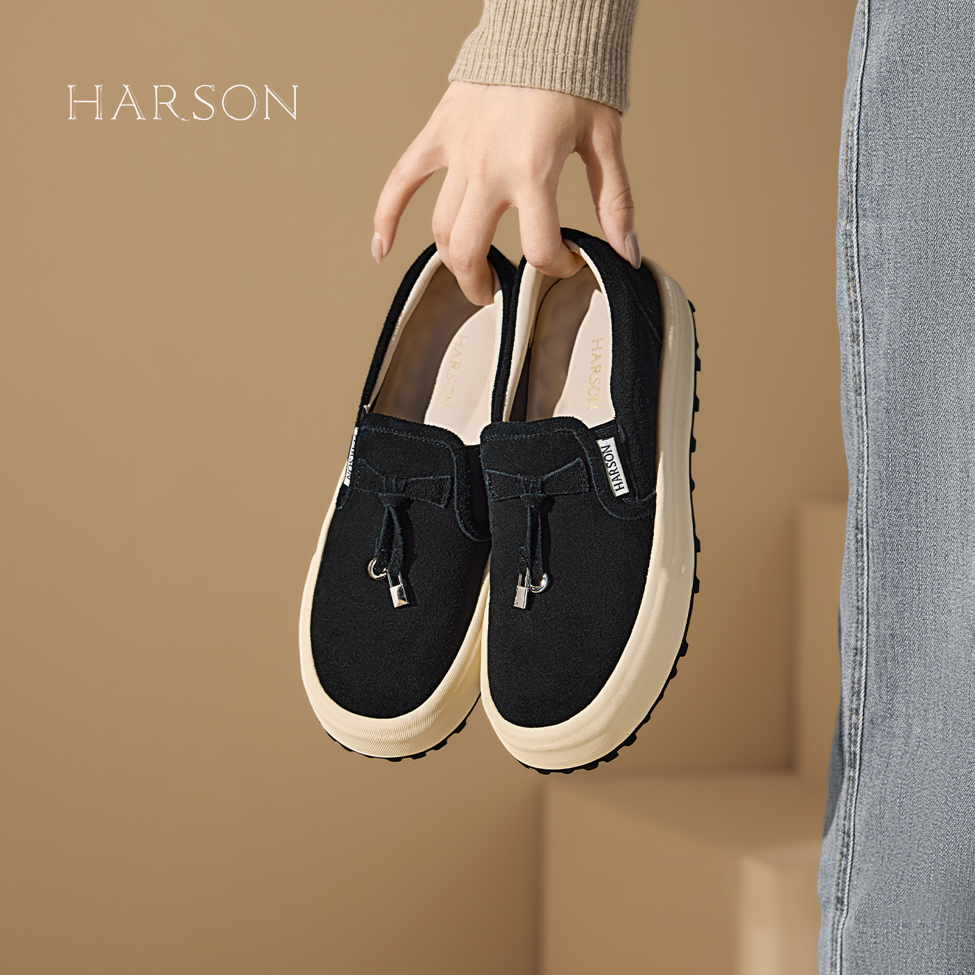 单鞋 哈森厚底豆豆鞋 轻便复古懒人一脚蹬软底乐福鞋 新款 女2025秋季