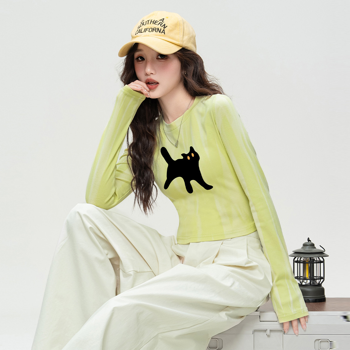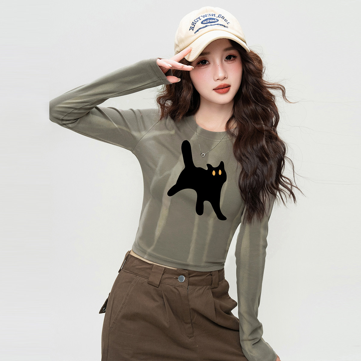 T恤运动辣妹短款 小猫印花修身 休闲上衣 长袖 ILOVECHOC2025秋季