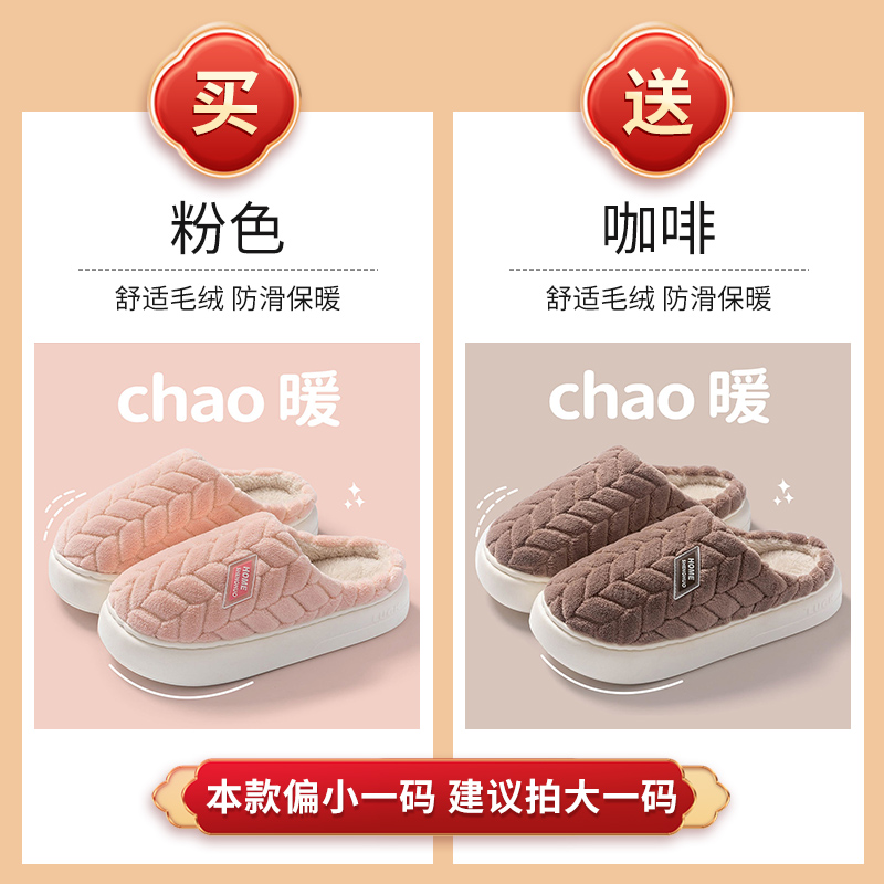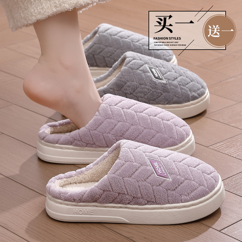 买一送一棉拖鞋 情侣室内家居一对保暖防滑厚底毛绒棉拖 女士秋冬季