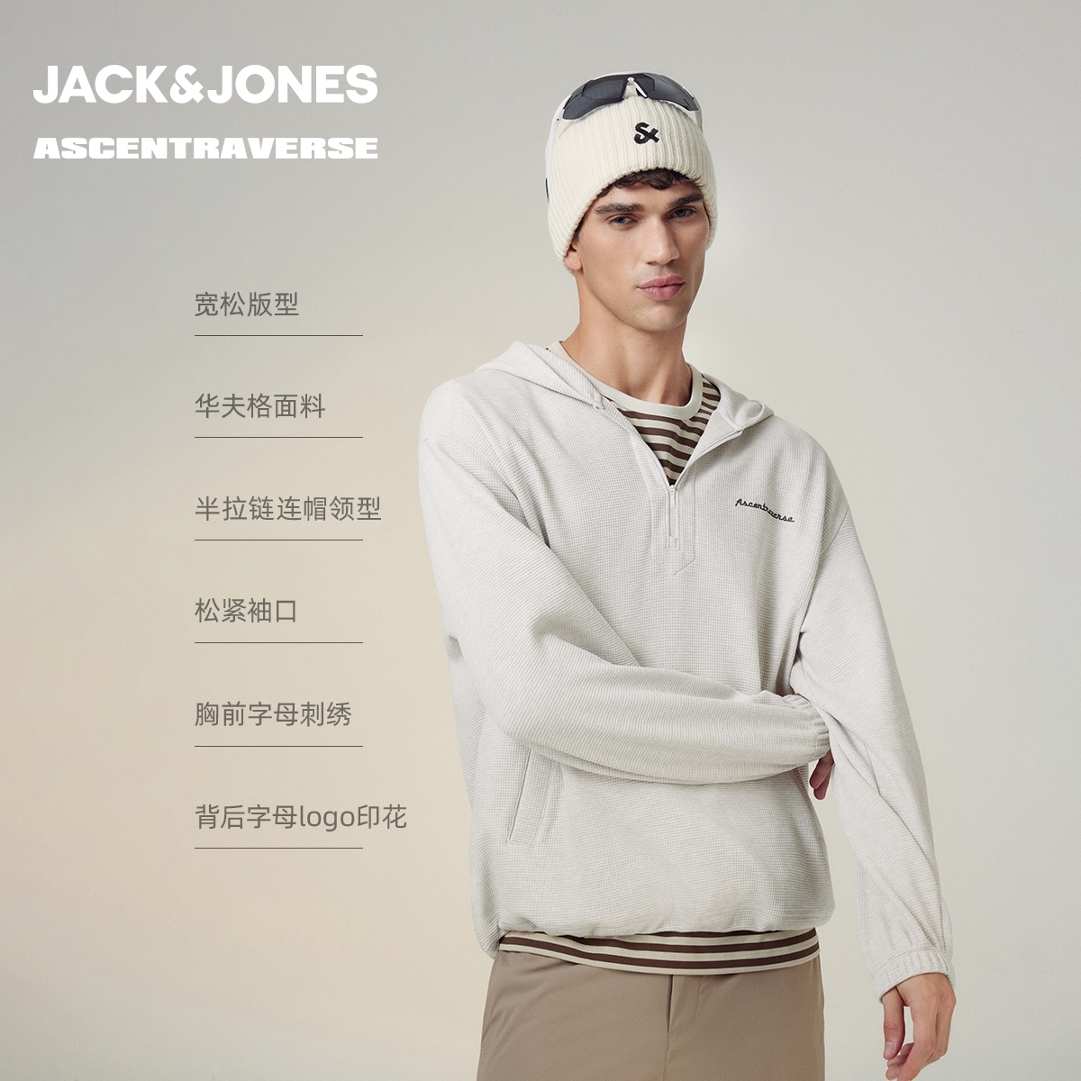 三福2025秋冬新款 宽松上衣506276 卫衣男字母印花连帽街头潮流开衫