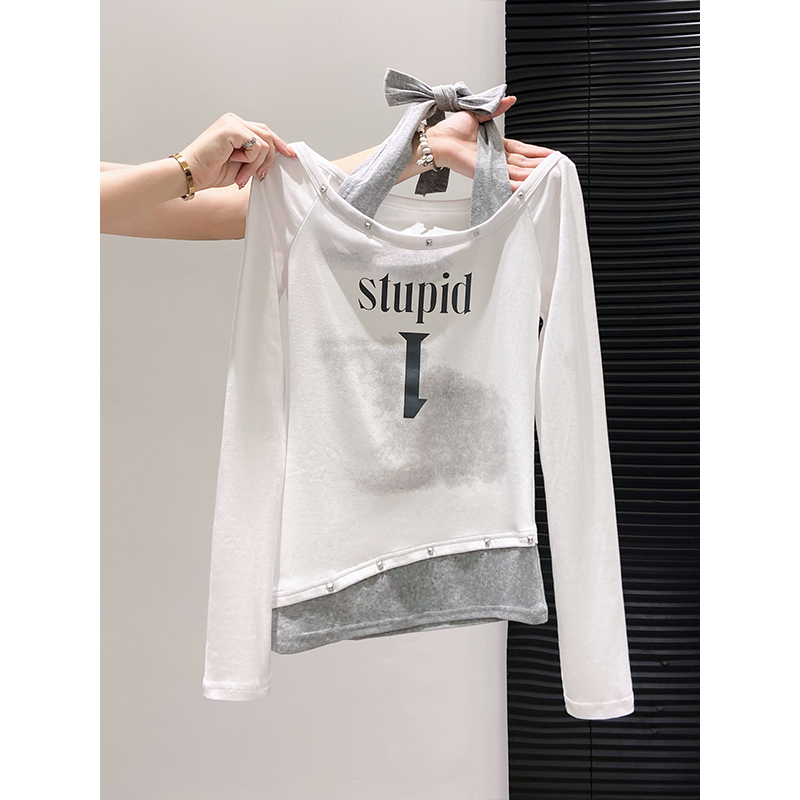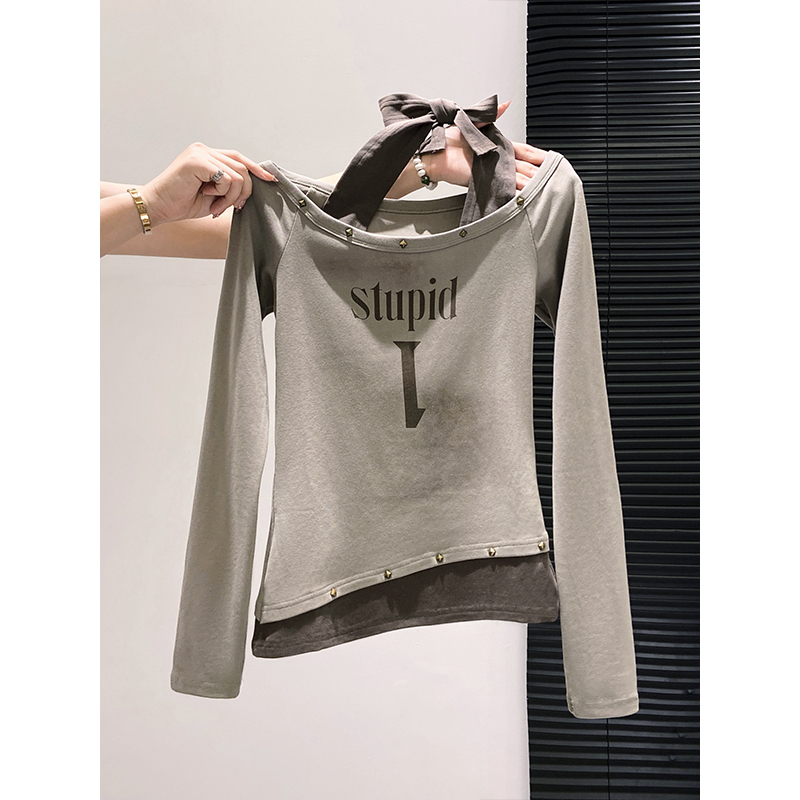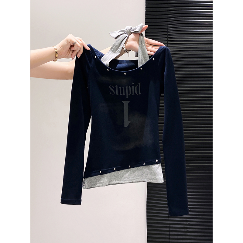 美式 挂脖假两件长袖 短款 修身 辣妹一字领露肩外穿上衣 t恤女早秋季