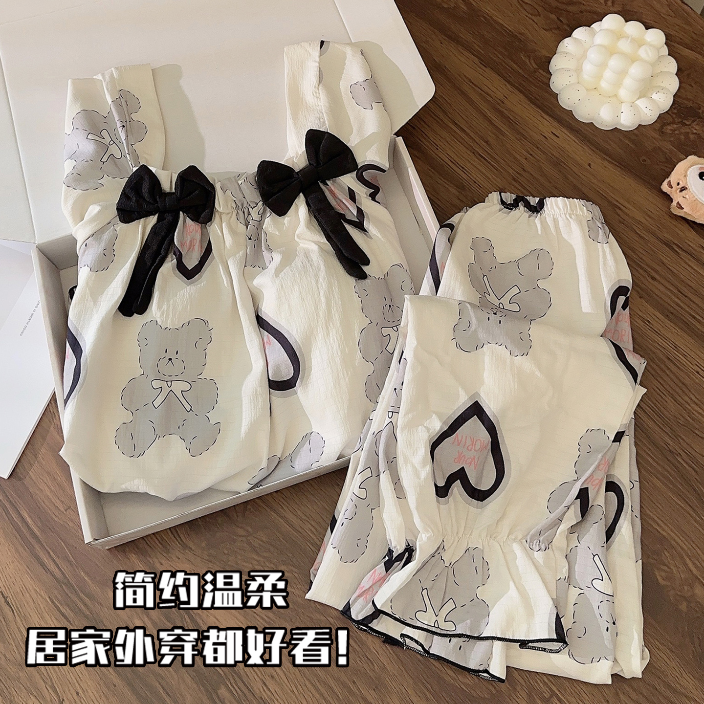 梭织棉卡通爱心小熊网红套装 长裤 家居服 长袖 带胸垫睡衣女春秋冬季